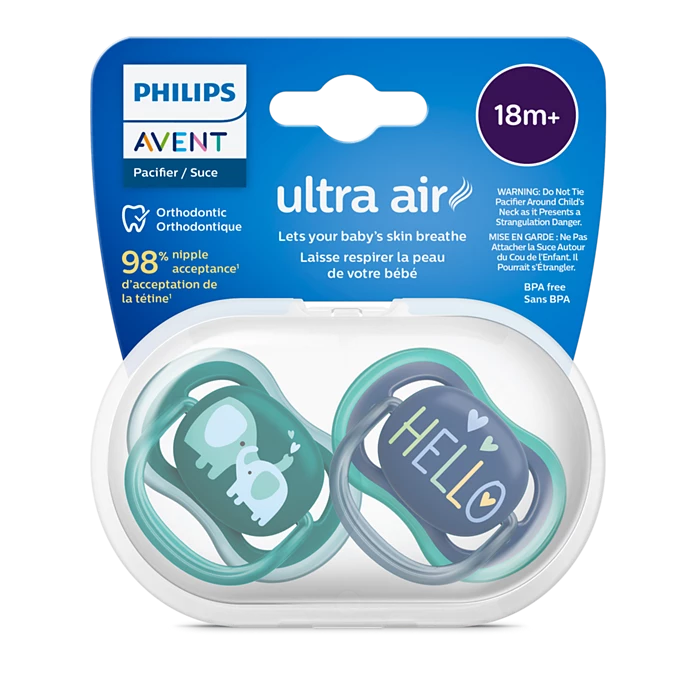 Soothe with the comfort of air. The Philips Avent ultra air pacifier has extra-large airholes to keep your baby's skin dry. It has an extra-firm teat for growing teeth and gums. Available in various colors and designs.