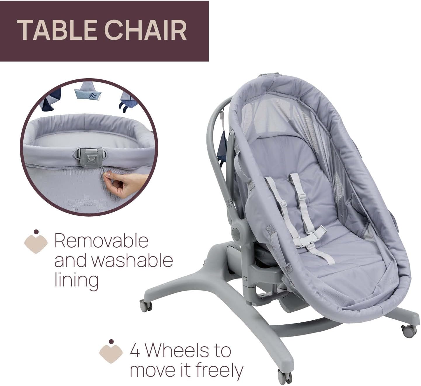 Baby Hug Pro is the 5in1 solution that helps manage baby's daily routine at home from birth to 36 months. Crib, stand-alone crib, recliner, highchair and table chair. In one product, 5 solutions.