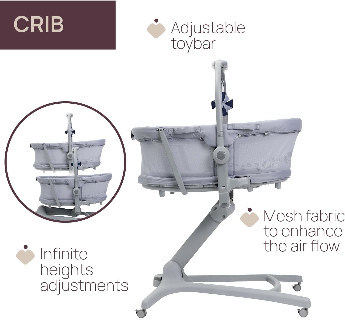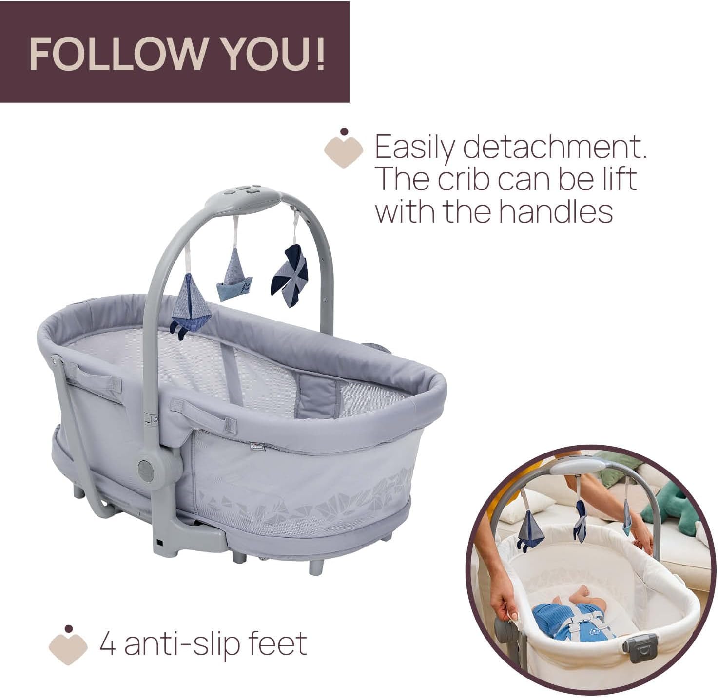 • FOLLOW YOU The crib can be easily detached from the structure and lift thanks to its 4 handles. STAND ALONE CRIB The crib can be used on the floor or on a flat surface thanks to its anti-slip feet.