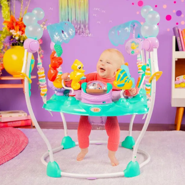 Jump under the sea and explore the deep blue with this immersive Disney Princess Ariel baby jumper! Introduce baby to your favourite The Little Mermaid character toys, including Sebastian the crab and best friend Flounder. Your baby will jump for joy as they enjoy the 10+ toys and activities this baby activity center provides.