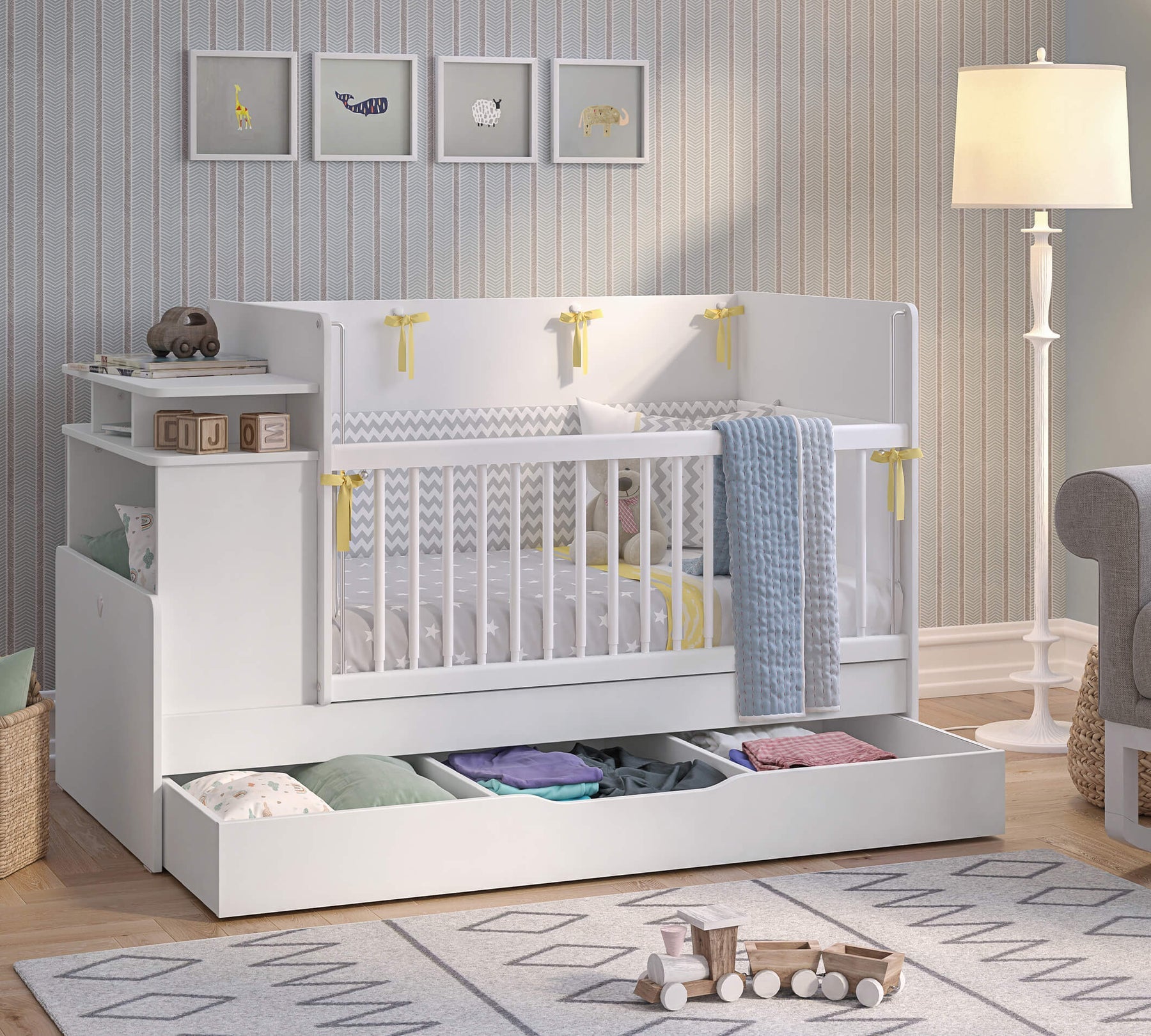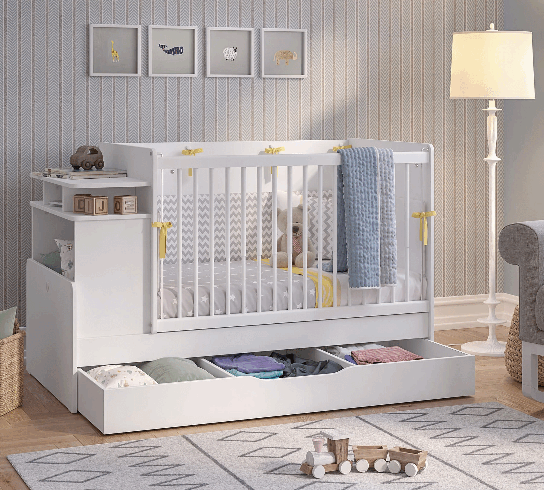0- 6-year-old Baby Cotton Tale Elevator produced for infants growing baby cot; It offers a multifunctional advantage with bars, round corners and shelf parts. It is also important for mothers to provide ease of use thanks to the elevator feature in this bed, which is important.
