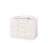 Baby Cotton wide dresser attracts attention with its high storage capacity that baby rooms need. Four wide -volume drawers and one lid partition can be organized for all clothes and accessories of babies. If you wish, you can add comfort and functionality to the product by adding a lower opening unit on the module. The dresser, which has a modern and stylish design, is one of the most useful modules of baby rooms.