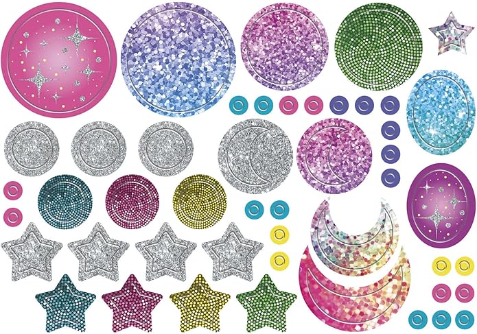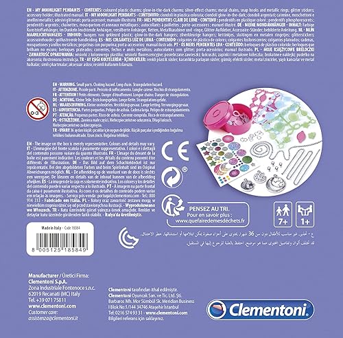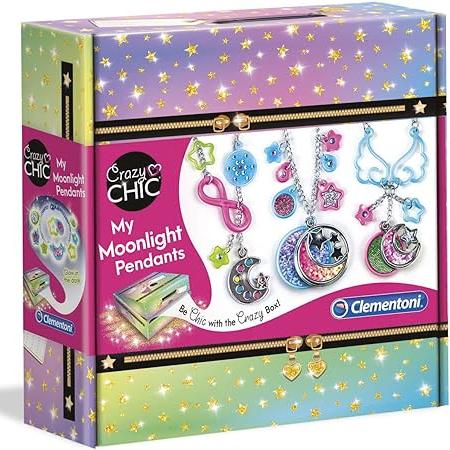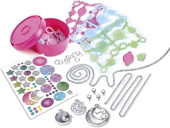 • The game contains: aluminium chains and rings, metallic and coloured plastic pendants in the shape of moon and stars, holographic stickers and adhesive gems.