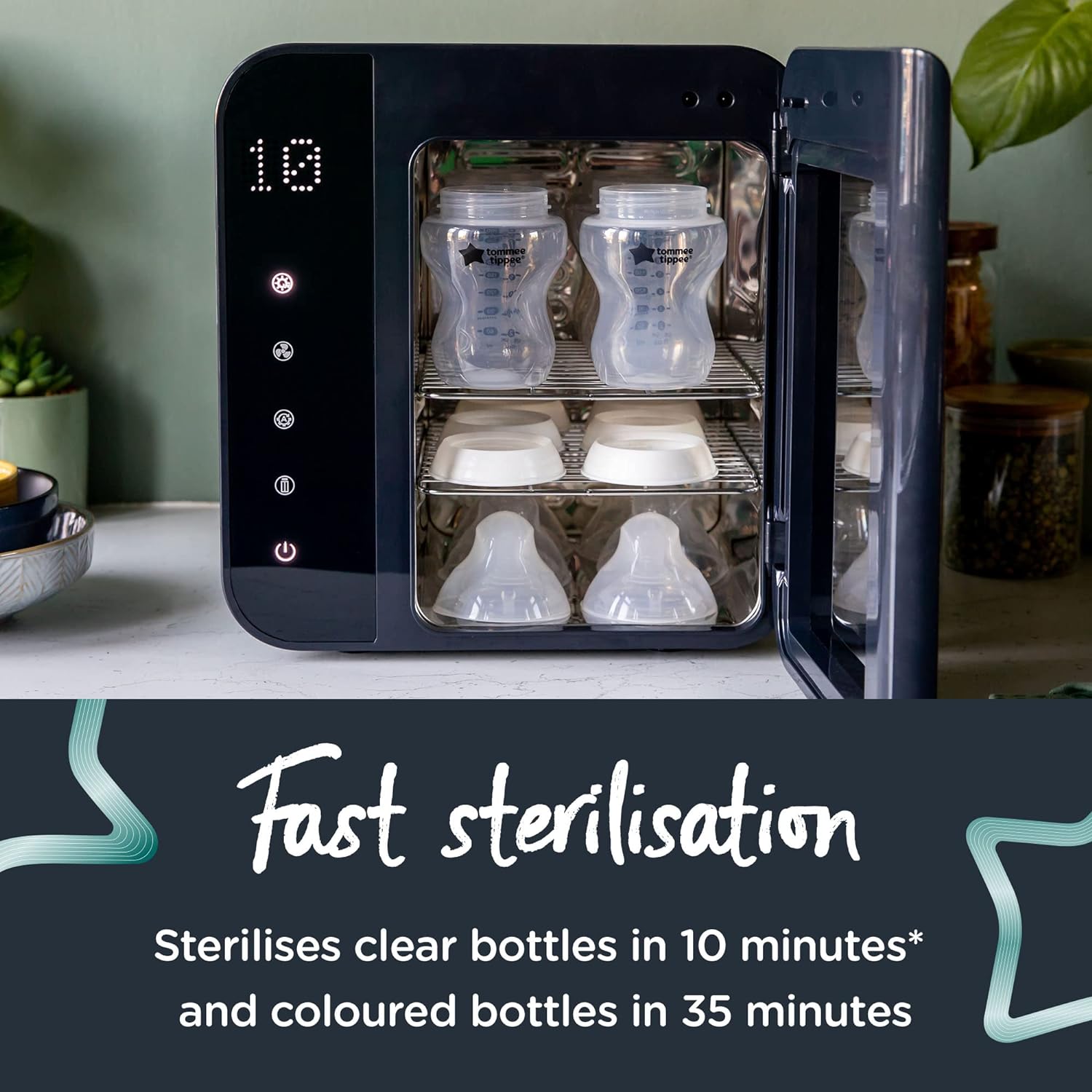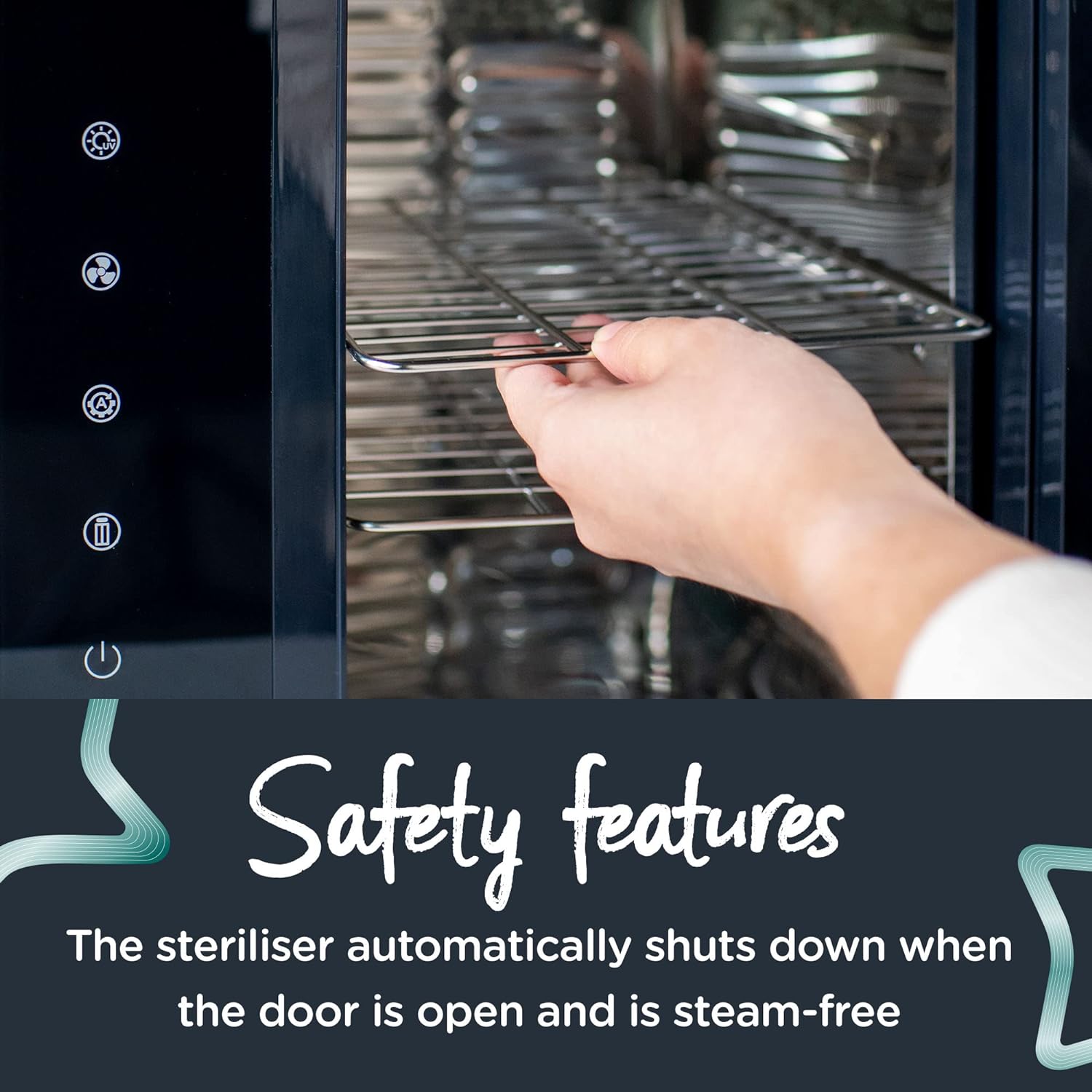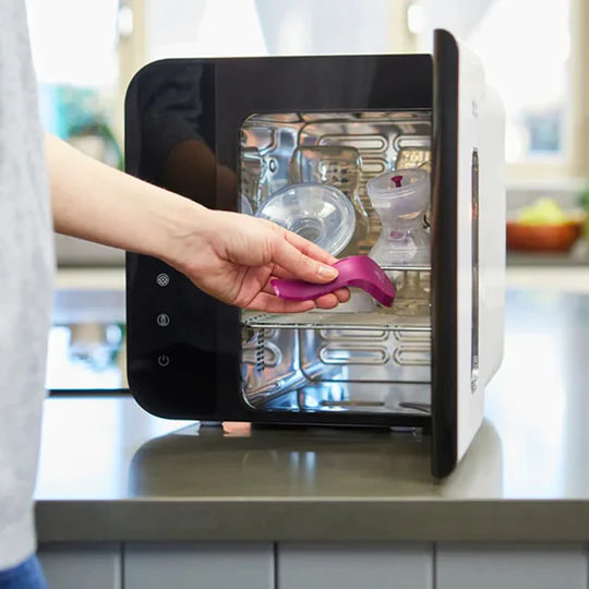 Our best steriliser. Expertly engineered to be safe for them, simple for you. UV light sterilises and dries everything you need to feed, fast. No water, no steam, no noise.
