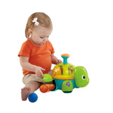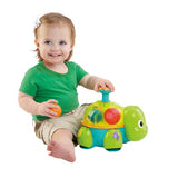 The having a ball drop 'n spin turtle from bright starts engages toddlers in a fun game of "hide and seek." three balls begin to spin and joyful melodies play when toddlers push down on the colorful plunger. As the balls drop down from the turtle's shell, toddlers "search" for them by lifting the turtle's legs. This perky little turtle also offers growing toddlers color and number identification through repetition. Lift one of the colorful lime-green legs to hear the number printed on the leg and the color of the ball inside. The drop 'n spin turtle inspires baby to use motor and reasoning skills in children 6 months to 3 years of age.