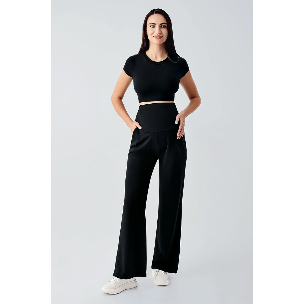 The fabric is comfortable and flexible. It has a wide mold. The waist has adjustable elastic. It is suitable for both daily use and for pregnancy and beyond. It can be washed at 30 degrees. Fabric Material: 95% Polyester, 5% Elastane Model Measurements: Size S, Height: 1.78, Chest: 88, Waist: 62, Hip: 90