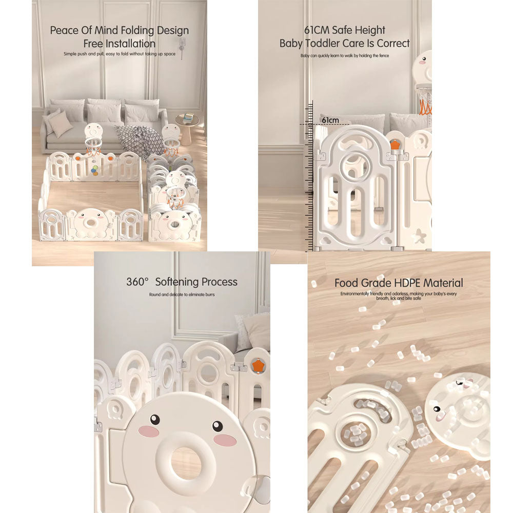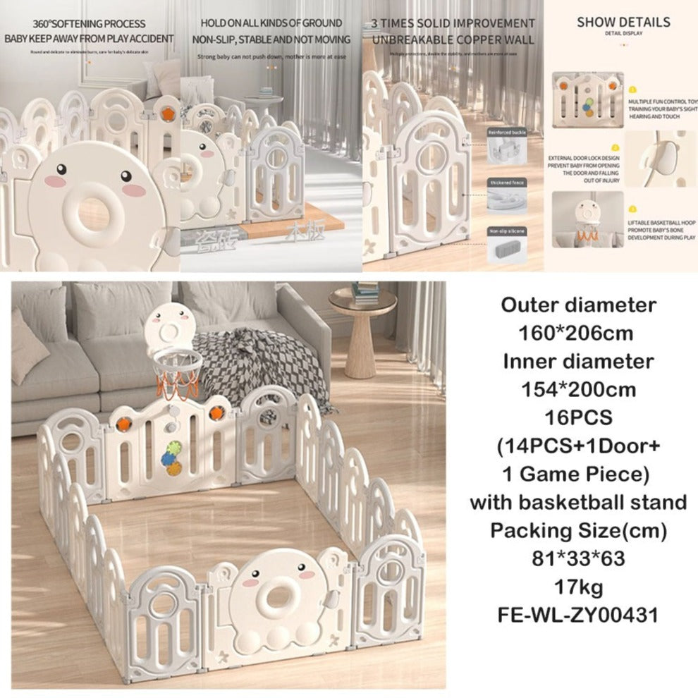The SunnyBear Baby Playpen With Basketball Hoop 160x206cm is a spacious, safe, and entertaining play area designed for young children. Featuring a cheerful, friendly-faced character and an integrated basketball hoop, it provides both a secure environment and engaging activities to stimulate your child’s development and imagination. The interlocking fence panels are easy to assemble and disassemble, making it convenient for parents and caregivers to set up and store.