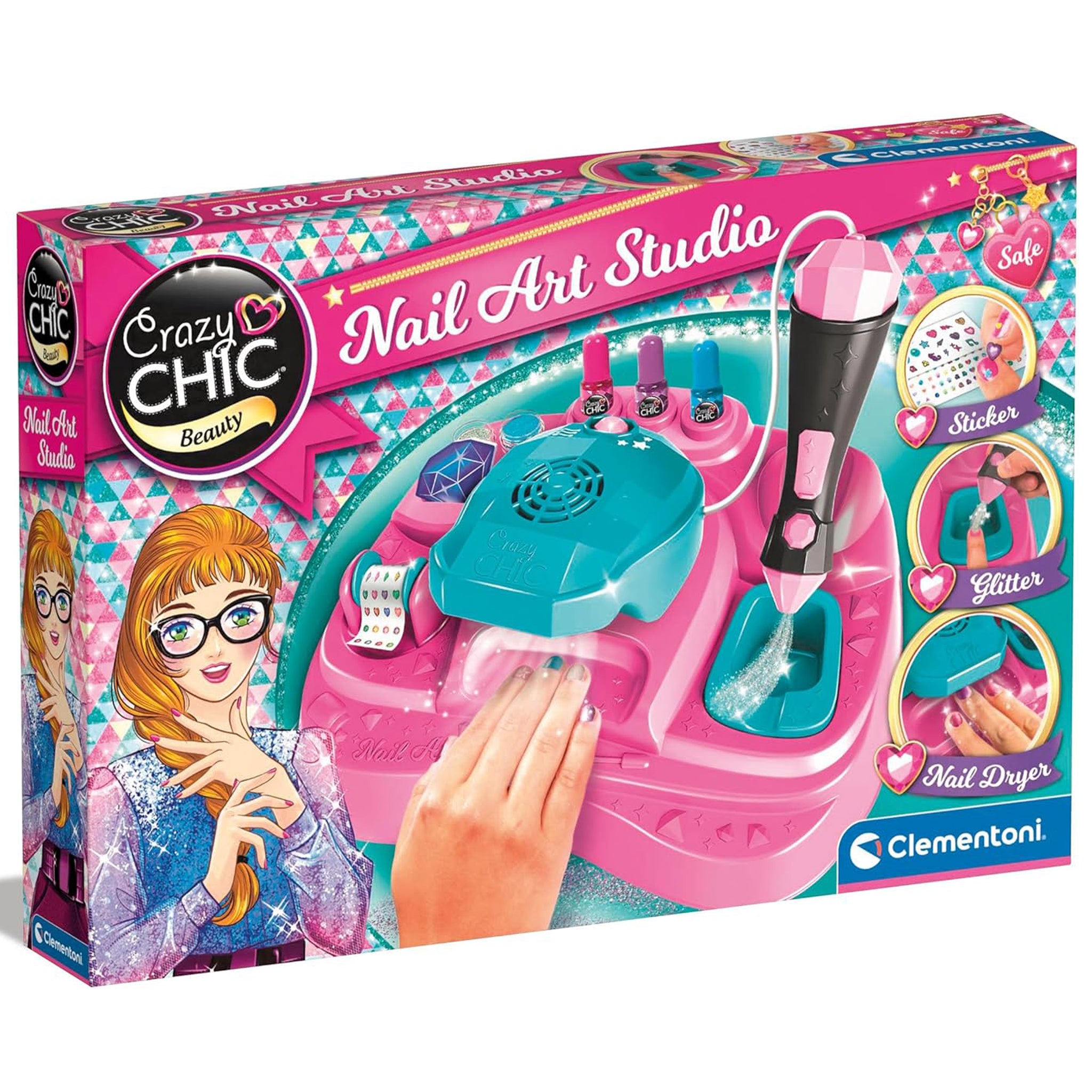 • Nail design complete set: the nail studio set contains nail polish in various bright colours, a practical nail polish dryer, varied stickers, a glitter spray device and the corresponding glitter