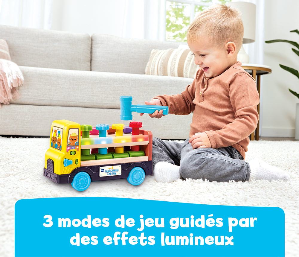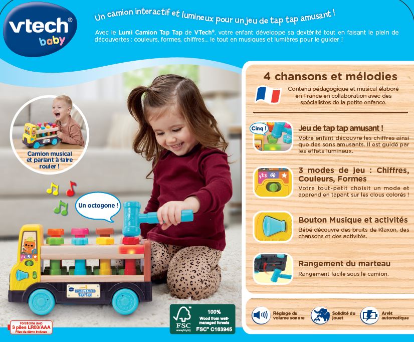 The VTech Baby Lumi Truck Tap Tap is an interactive toy designed for toddlers. This bright and colorful truck features FSC certified wooden parts and promotes dexterity while providing fun learning experiences. Through a tap tap game, children can explore numbers, colors, and shapes, guided by light effects and engaging sounds.