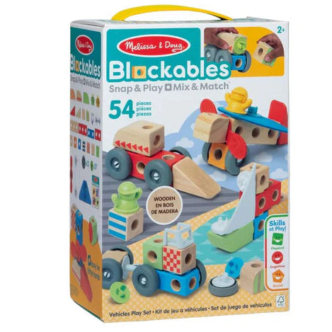 Melissa & Doug Blockables Vehicles Play Set is a 54-piece wooden building toy designed for children aged 2 to 7. This set features connectable, stackable blocks and connectors that allow kids to build a variety of vehicles, fostering creativity and key developmental skills through screen-free play.