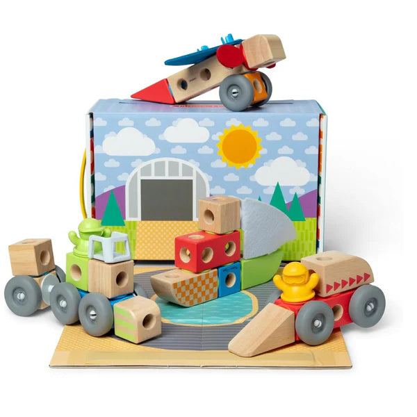 • Contains 54 pieces: 18 wooden blocks / 17 connectors / 2 play figures / Felt wings, propeller, and sail with built-in connectors / Tractor hitch and windshield
