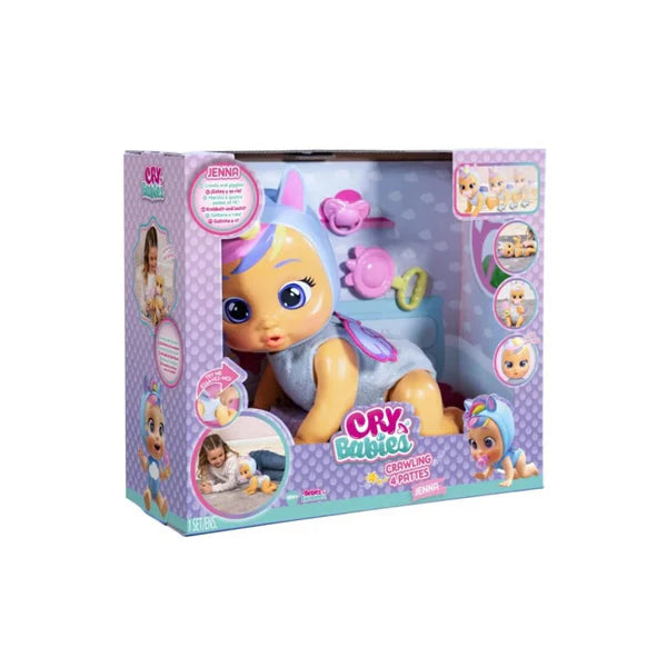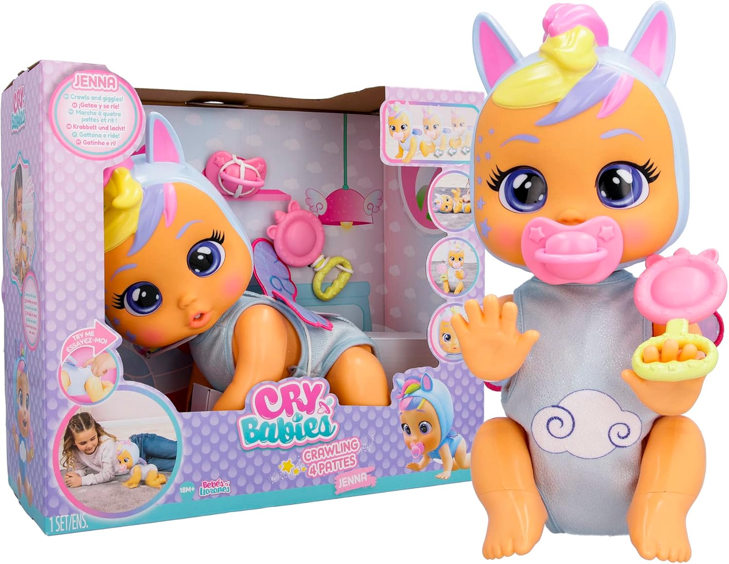 • The new Cry Babies Crawling Jenna moves like a real baby, with crawling actions, giggles, and interactive responses. Press the cloud button on her back to make her crawl. When she is lying down and tickled, her arms and legs move as she laughs. Sit her up and place the rattle in her hand to see her play with it. She features painted eyes and hair and comes dressed in unicorn themed pajamas. The set includes her pacifier and rattle. Like other Cry Babies, she produces real tears when the pacifier is removed and stops when it is returned. She includes 35 realistic baby sounds.