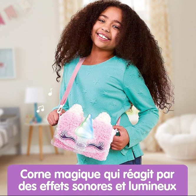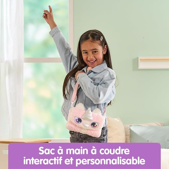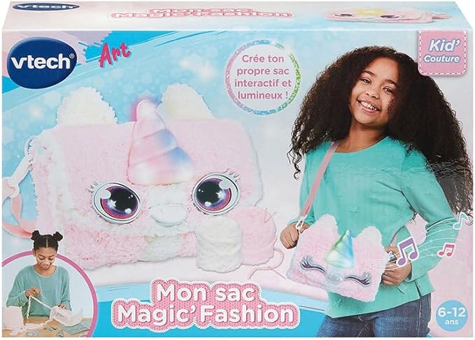 The Vtech Kid'couture - My Magic' Fashion Bag - Unicorn is a 100% handmade sewing and assembly kit designed for children aged 6 and up. This unique craft project allows kids to create and interact with their very own unicorn-shaped bag, combining creativity with fun features.