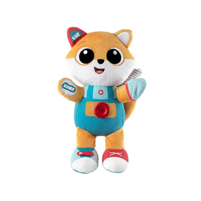 Soft evolutive interactive fox that helps children learn body parts and how to get dressed in a fun entertaining way.