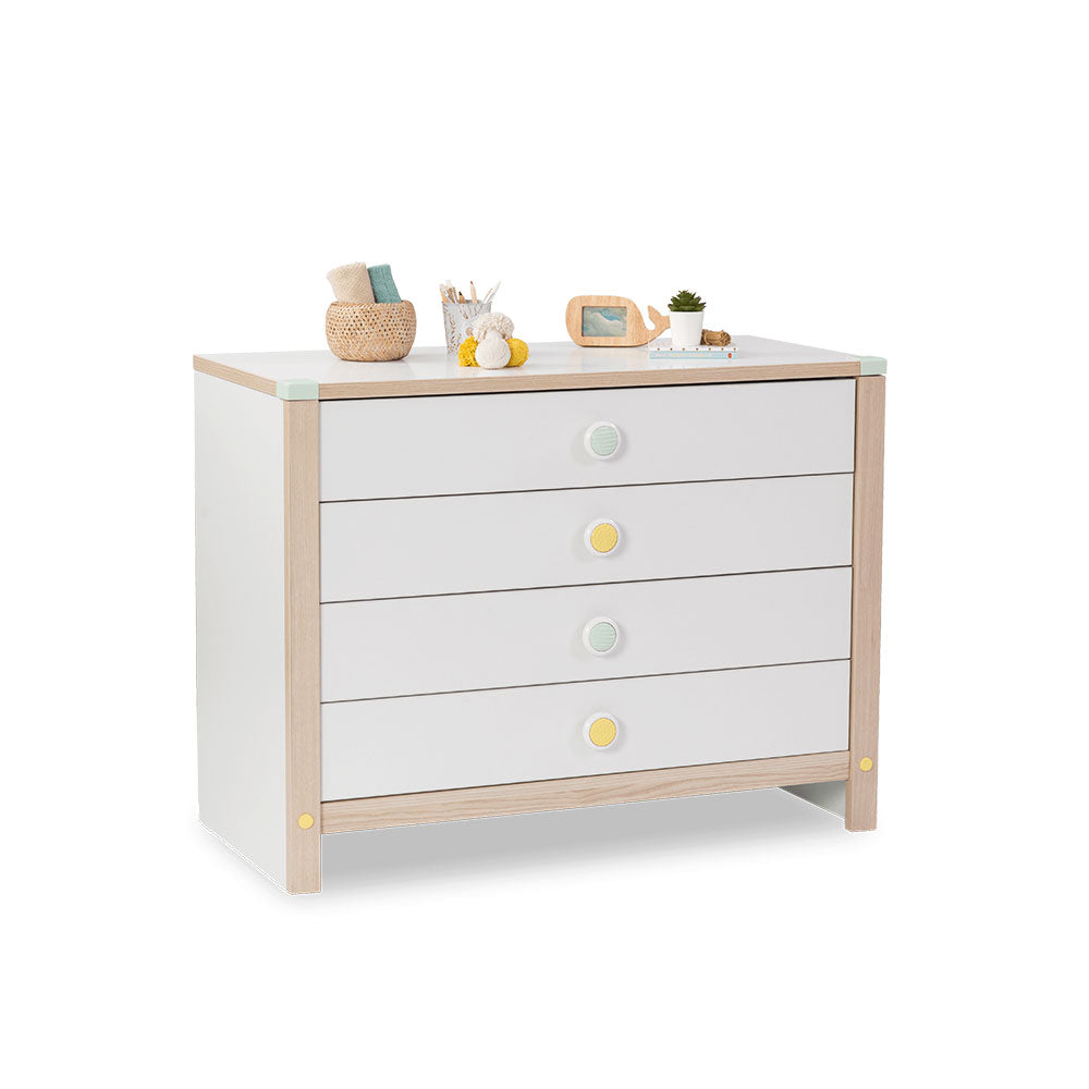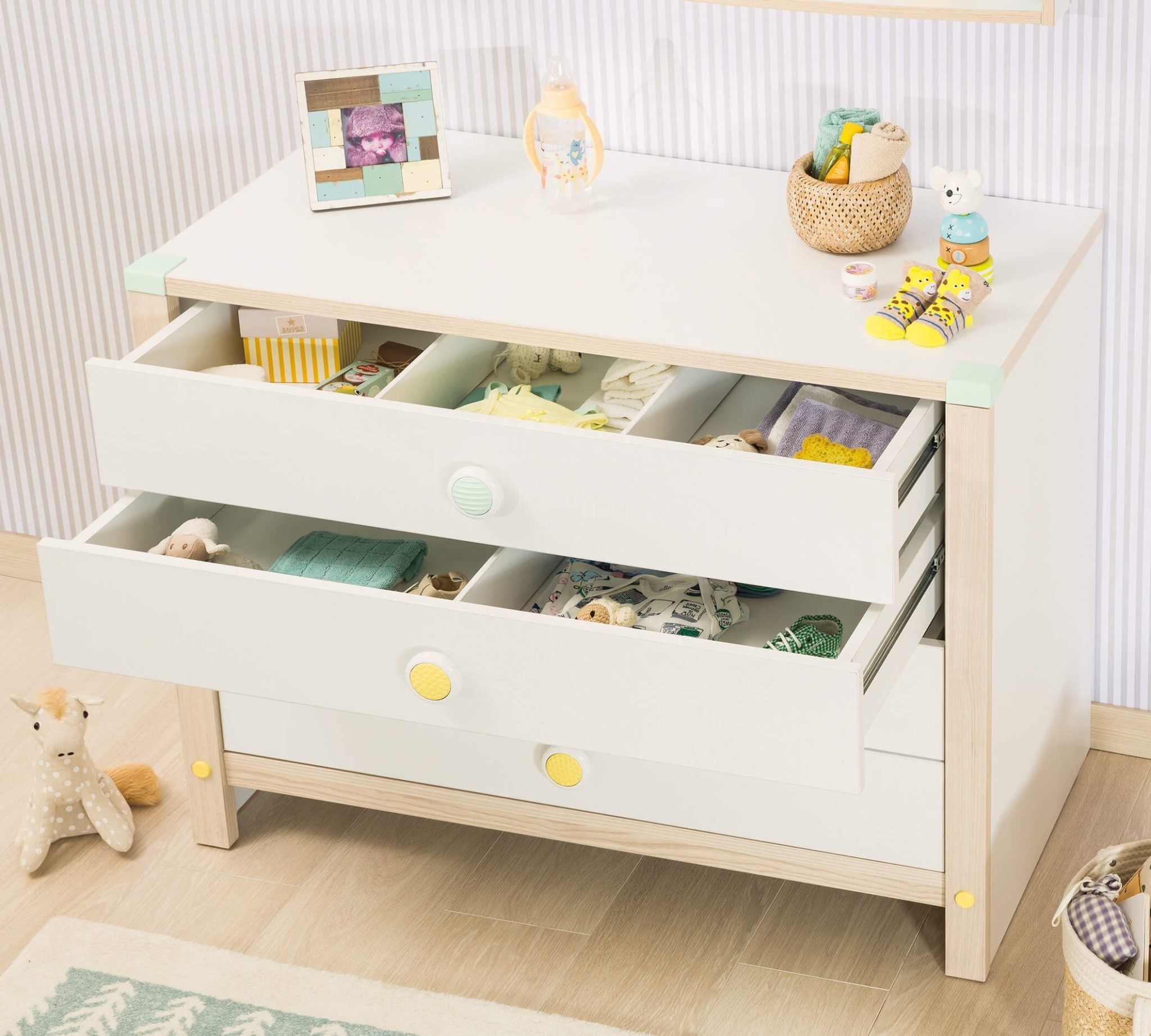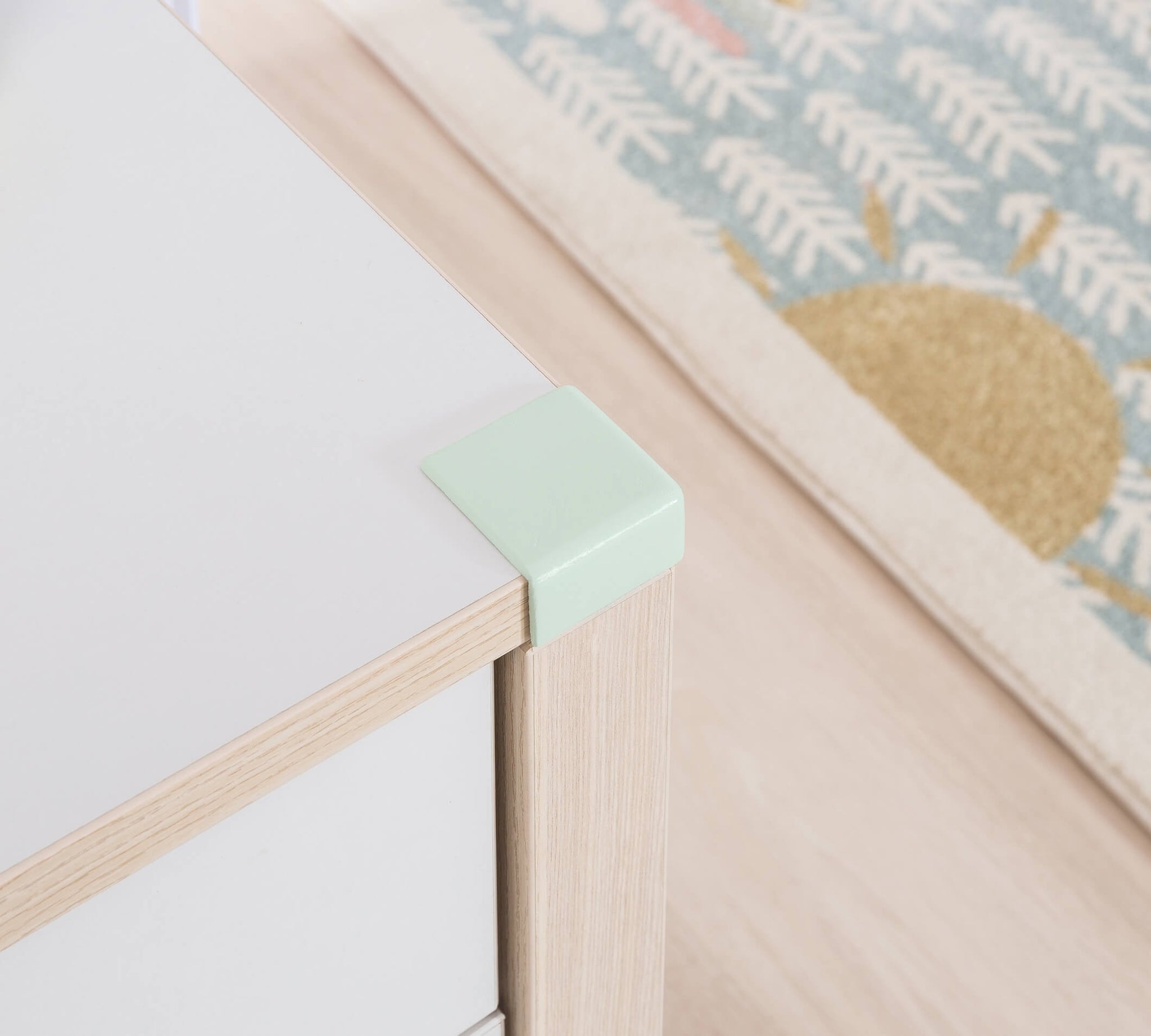 The MONTE baby room set was developed in accordance with TÜV GS standards for safety, health, and ergonomics. The bassinet in the crib is adjustable to two heights. Three removable bars allow the child to climb in and out independently. Colorful wooden elements on the bars support your baby's visual and mental development. The changing table attachment can be easily removed from the dresser and used as a stylish wall shelf.