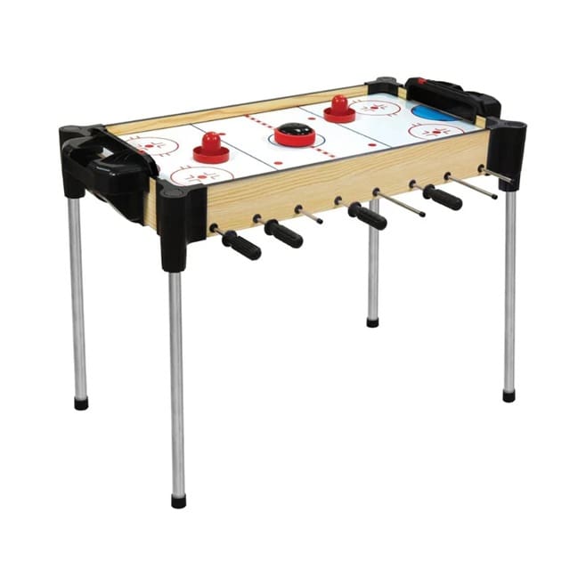 The Ambassador 32″ (82cm) 2-in-1 Reversible Football (Foosball/Soccer) & Hover Puck Air Hockey Table offers a dynamic gaming experience, combining two popular games in a single, innovative design.