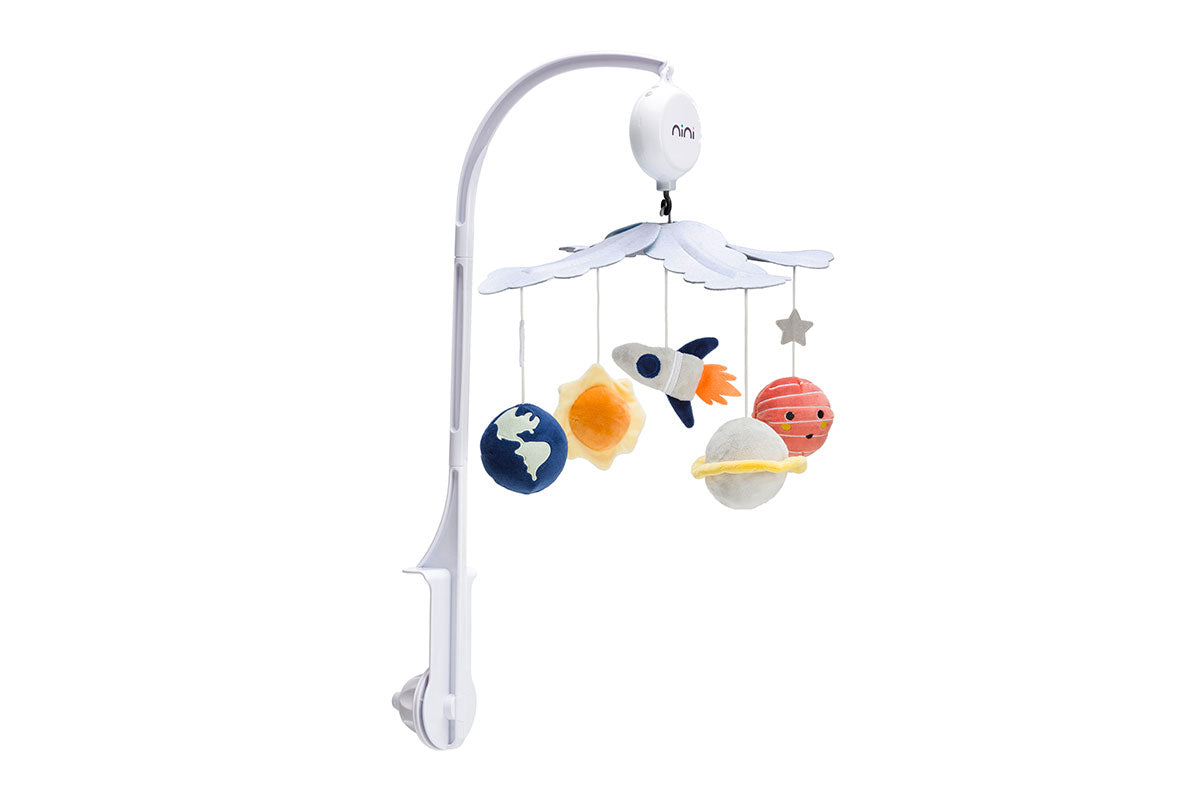 Perfect for babies Om+, this essential product for new parents brings the magic of the universe closer to your little one. This Cot Mobile features plush velour planets in primary bright colours, orbited by a rocket, moon and star under scalloped white arms making it a perfect bedtime essential.