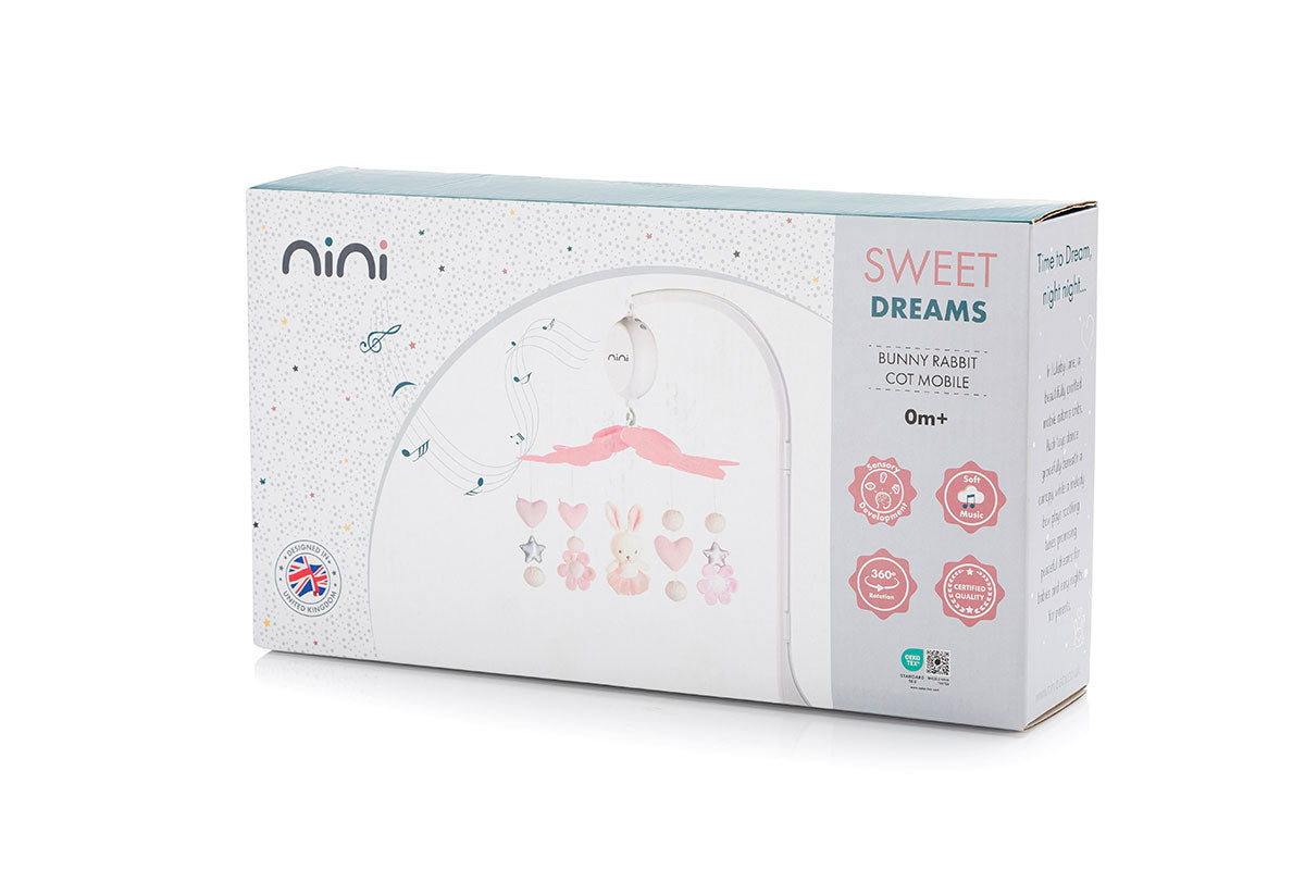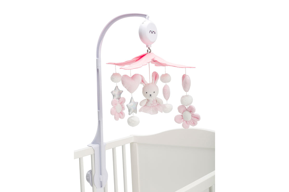 Our Nini Cot Mobile – Bunny Rabbit Pink is a 360° rotating wonder, featuring a digital music box, perfect for babies Om+. It enchants your baby with five charming, gently spinning soft toys, fostering their visual and motor skills. The digital music box serenades your little one with 12 soothing lullabies, creating a peaceful and magical bedtime experience.