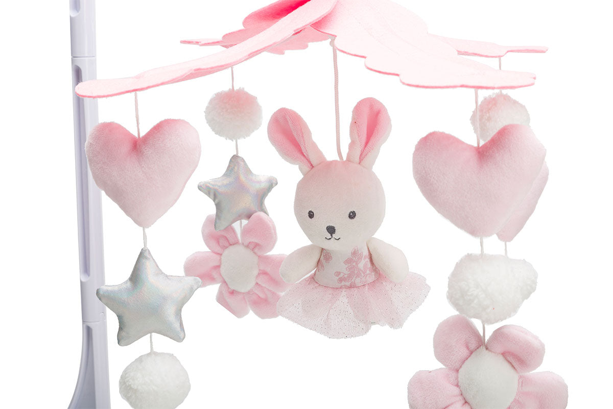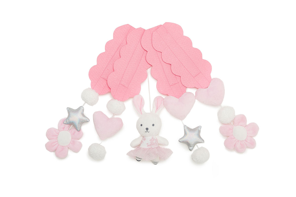 Create a serene wonderland in your baby’s nursery with our enchanting Nini Cot Mobile – Bunny Rabbit Pink. Imagine your little one drifting off to sleep, gazing at an adorable pink bunny rabbit in a cute skirt, surrounded by felt flowers, hearts, and twinkling stars, all hanging from arms. Featuring a digital music box, it plays gentle melodies that create a magical and soothing environment for your precious one, turning bedtime into a cherished moment for both parents and the baby. In the lullaby lane, a beautifully crafted cot mobile adorns cribs. Plush toys dance gracefully beneath a canopy, while a melody box plays soothing tunes, promising peaceful dreams for babies and easy nights for parents.