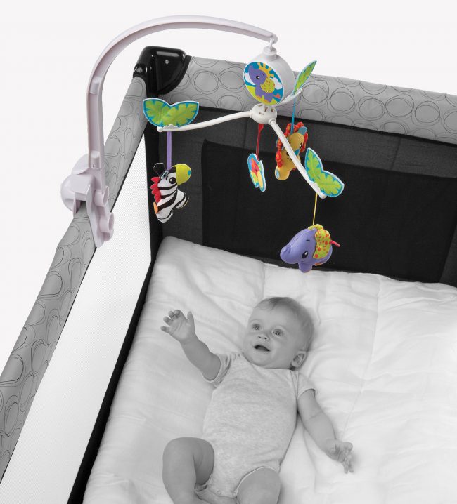 A bright, fun wind-up musical mobile, easy to attach to the side of the cot and most portable cots. The mobile features adorable characters and a wind-up music box to play gentle melodies to calm baby. Baby will love watching the characters gently turn around as they fall asleep. Designed to develop eye tracking and sound perception skills.