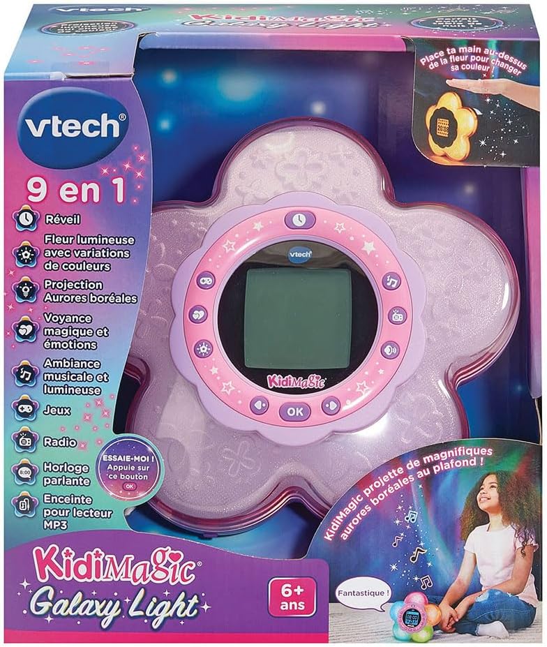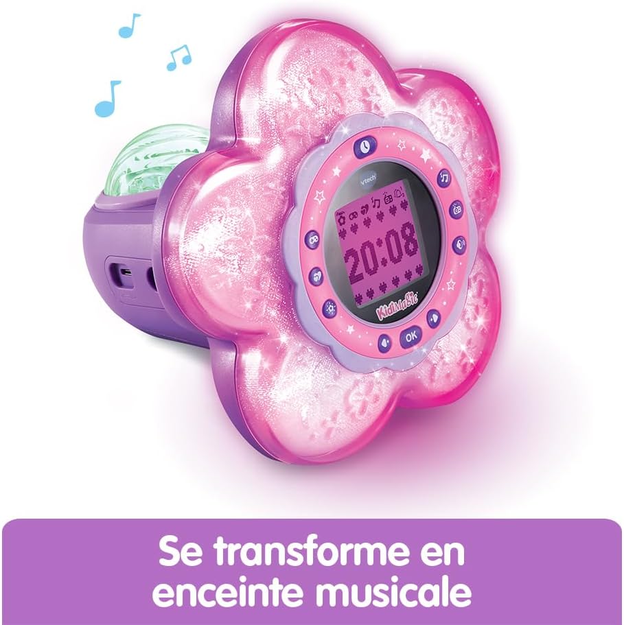 • 9 in 1, this light alarm clock shows the time on its backlit display and records FM radio stations. Every morning, the child wakes up to the alarm sound of their choice with KidiMagic Galaxy Light. It can then create a musical and bright atmosphere by listening to the music already embedded in this magical flower.