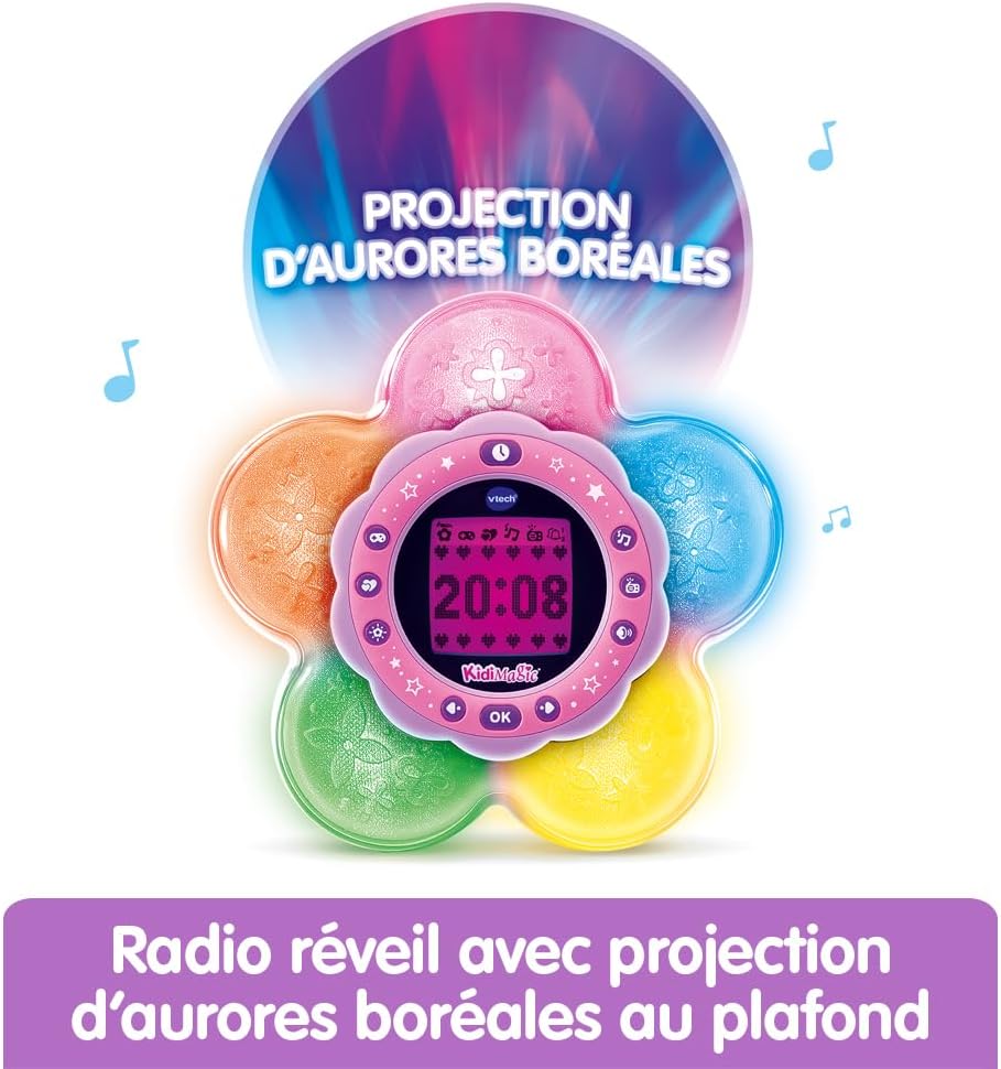 • The French version of this flower-shaped talking clock inspires children aged 6 and over by the projection of a bright and colourful phenomenon on the ceiling of their room that can be observed in the sky: the northern lights