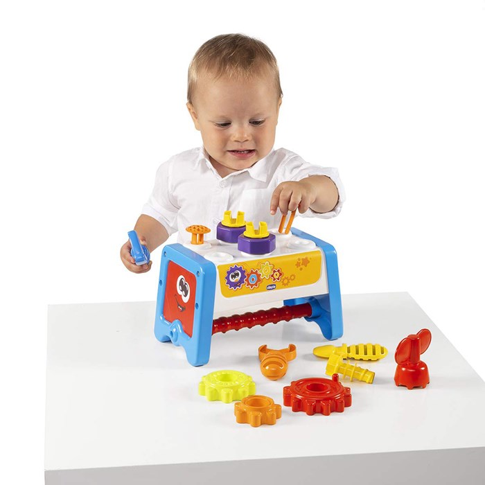 the toy is a STEM product, pushing babies to an early approach to logical association, cause effect and manual skills! It consist of the bench itself and 13 different pieces such as an hammer, a screwdriver, a wrench, screws, gears, bolts, to play with.