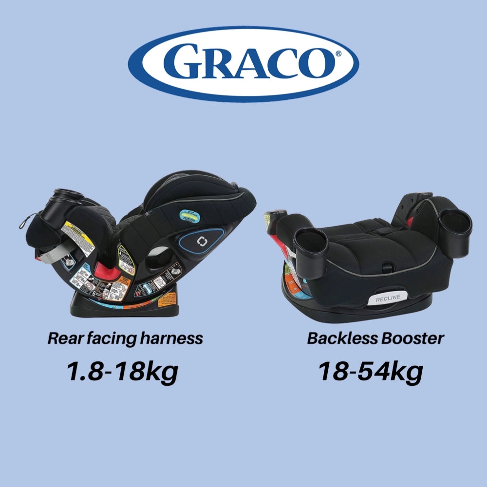 rear-facing car seat (1.8-18kg) to forward-facing 5-point harness seat (10-29 kg) to highback belt-positioning booster (18-45 kg) to backless belt-positioning booster (18-54 kg).