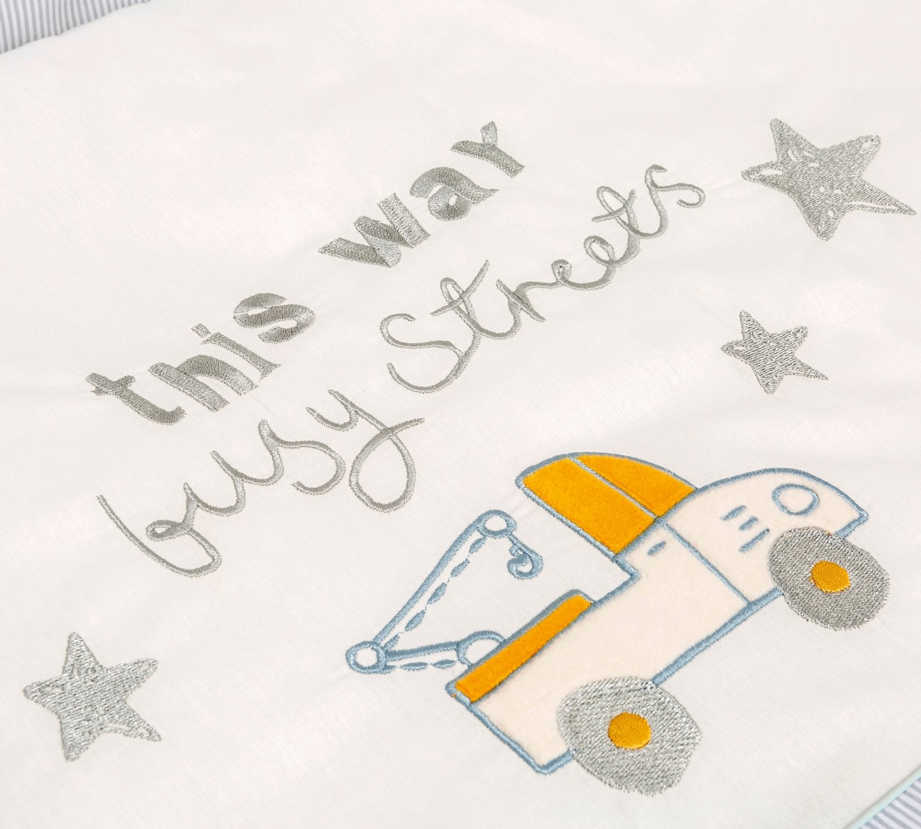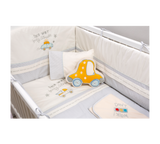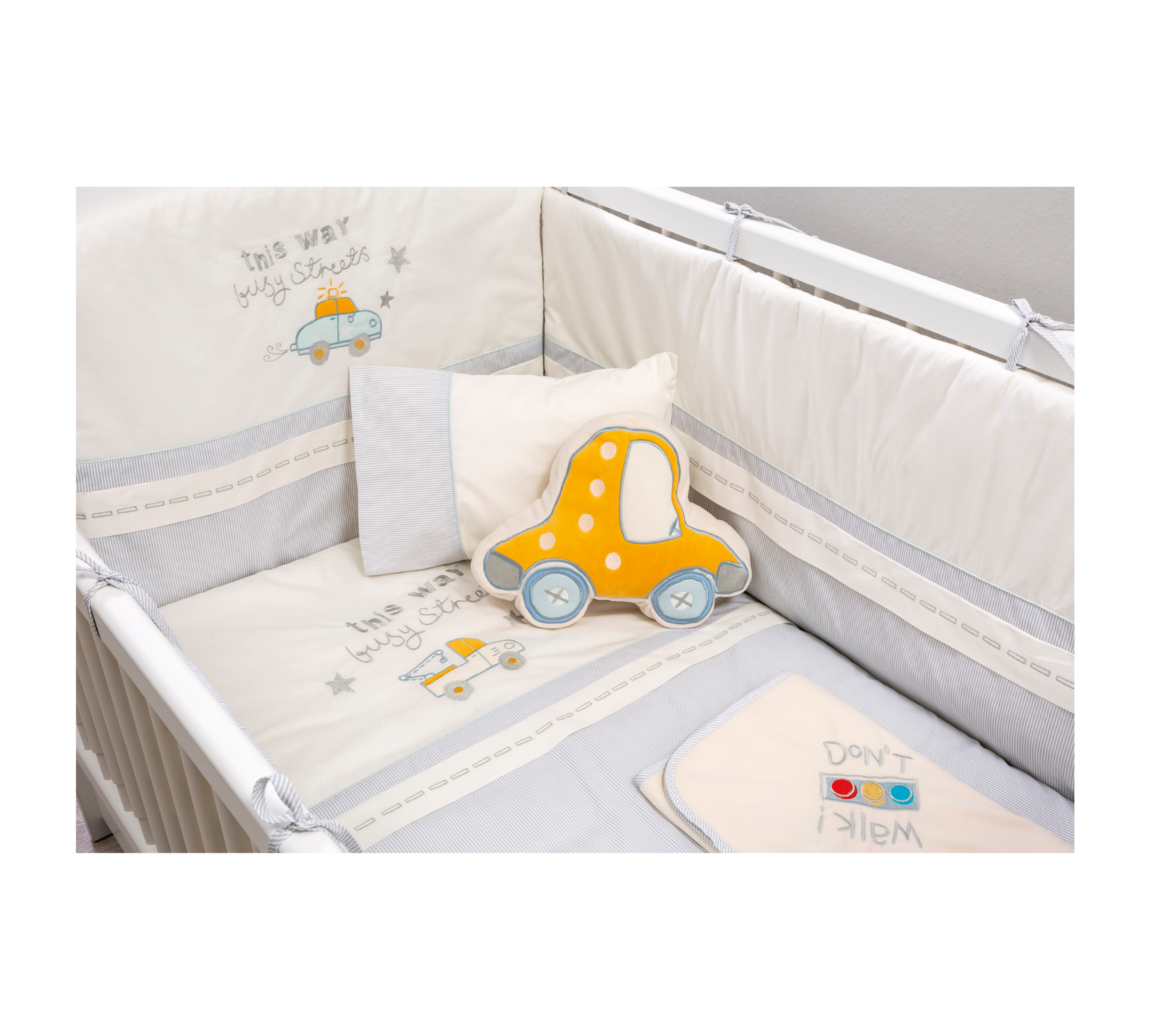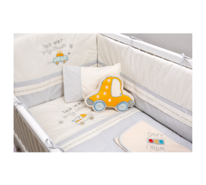 The Cars Sleeping Set is appreciated with its dimensions of 75x115 cm and its design that surrounds the baby cot. The sleeping set includes 1 quilt, 1 fleece blanket, 1 sheet without rubber, 1 pillowcase, 1 decorative pillow, front protection, back protection and foot-head protection. The blue striped and cream main fabric of the sleep set is 100% cotton.