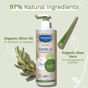 Formulated with organic olive oil and 97% ingredients of natural origin, this 2 in 1 gel gently cleanses, moisturizes and compensates for the skin-drying effect of bathing. Vegan, fragrance-free.