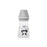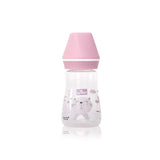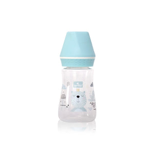 • Transparent bottle for baby food made of high quality polypropylene. Equipped with an anti-colic silicone pacifier for babies from 0-6 months it is durable and safe to the highest standards. The pacifier designed to be as similar as possible to the mother's breast allowing an alternative feeding without the risk of frequent cramps thanks to a very efficient ventilation system. The wide neck of the bottle and the legible scale on the side of it will allow you to easily and quickly prepare the meal for your baby. The theme of this bottle is a cute little bear with a blue cap.