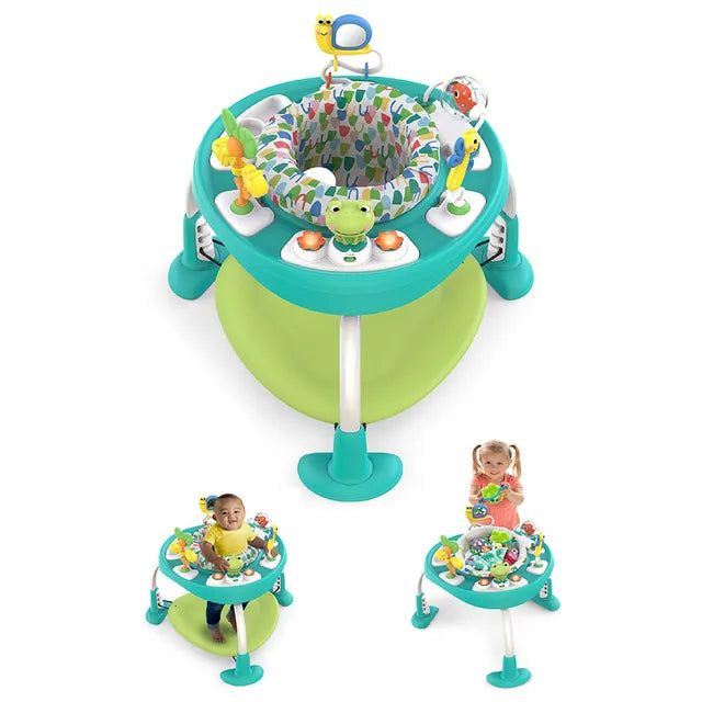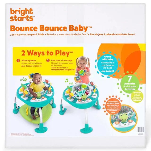 Get ready for bouncy, jumpy fun with the bounce bounce baby 2-in-1 activity jumper & table from Bright Starts. You'll get years of use out of this grow-with-me jumper by converting it into a standing activity table for toddler play (pssst there's a toy storage bag included, too!). In jumper mode, our 3-position height adjustable bouncy pad lets baby jump for joy at just the right height. , , The seat pad rotates 360 degree for easy access to all the toys and activities. The electronic frog toy station makes playful ribbit sounds and plays music, with light-up lily pads to delight your baby's eyes and ears. As baby grows, remove the bouncy pad and create a standing play table. Easily swap out the baby seat for our toy storage bag to help keep play sessions tidy and your toddler's favorite toys within reach. Babies and toddlers will love the 7 interactive toys in this Playful Pond fashion, like the dragonfly spinner and snail self-discovery mirror. With a space-saving pondscape packed with activities, entertaining your growing kiddo is just a walk in the park!