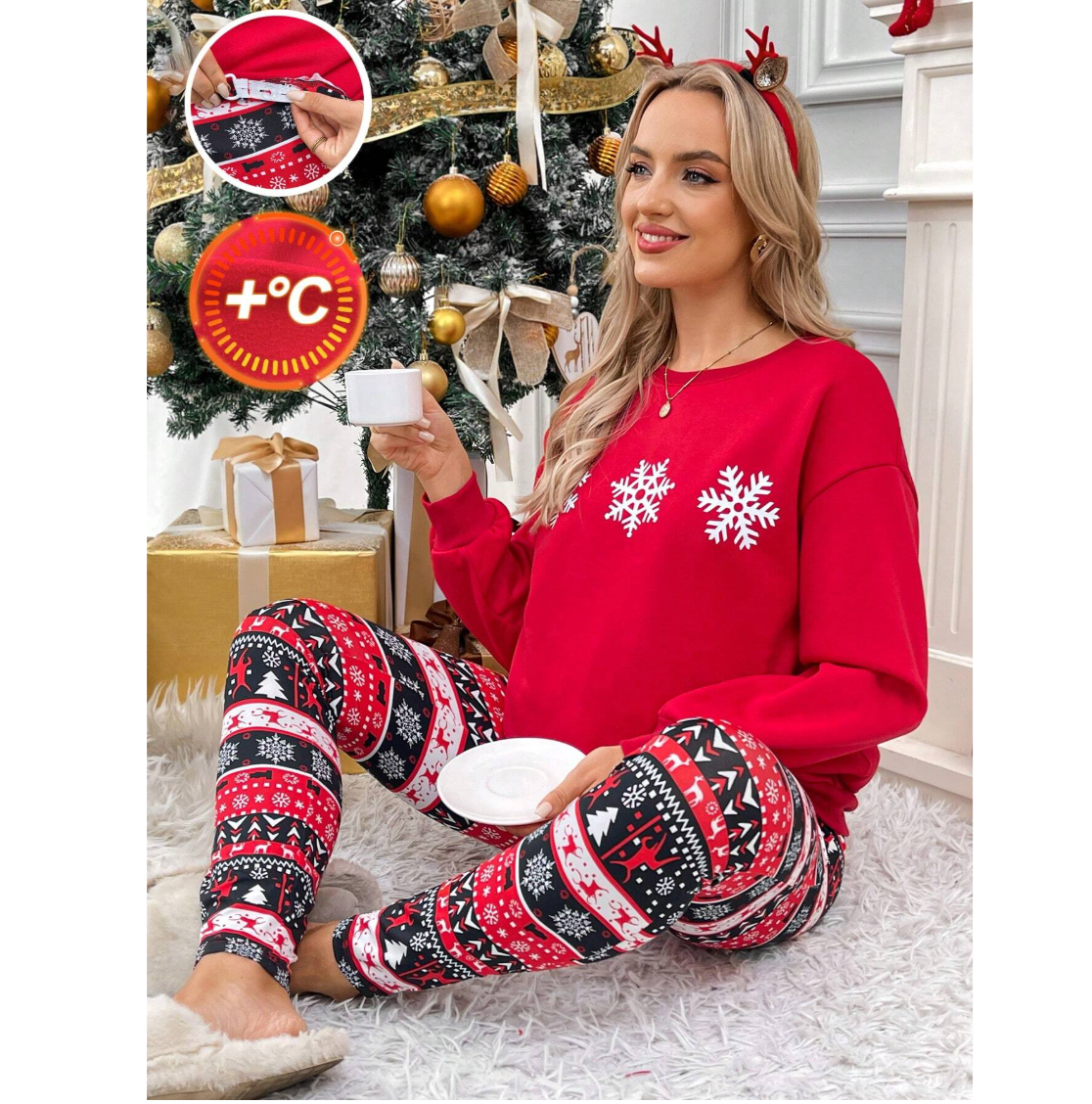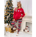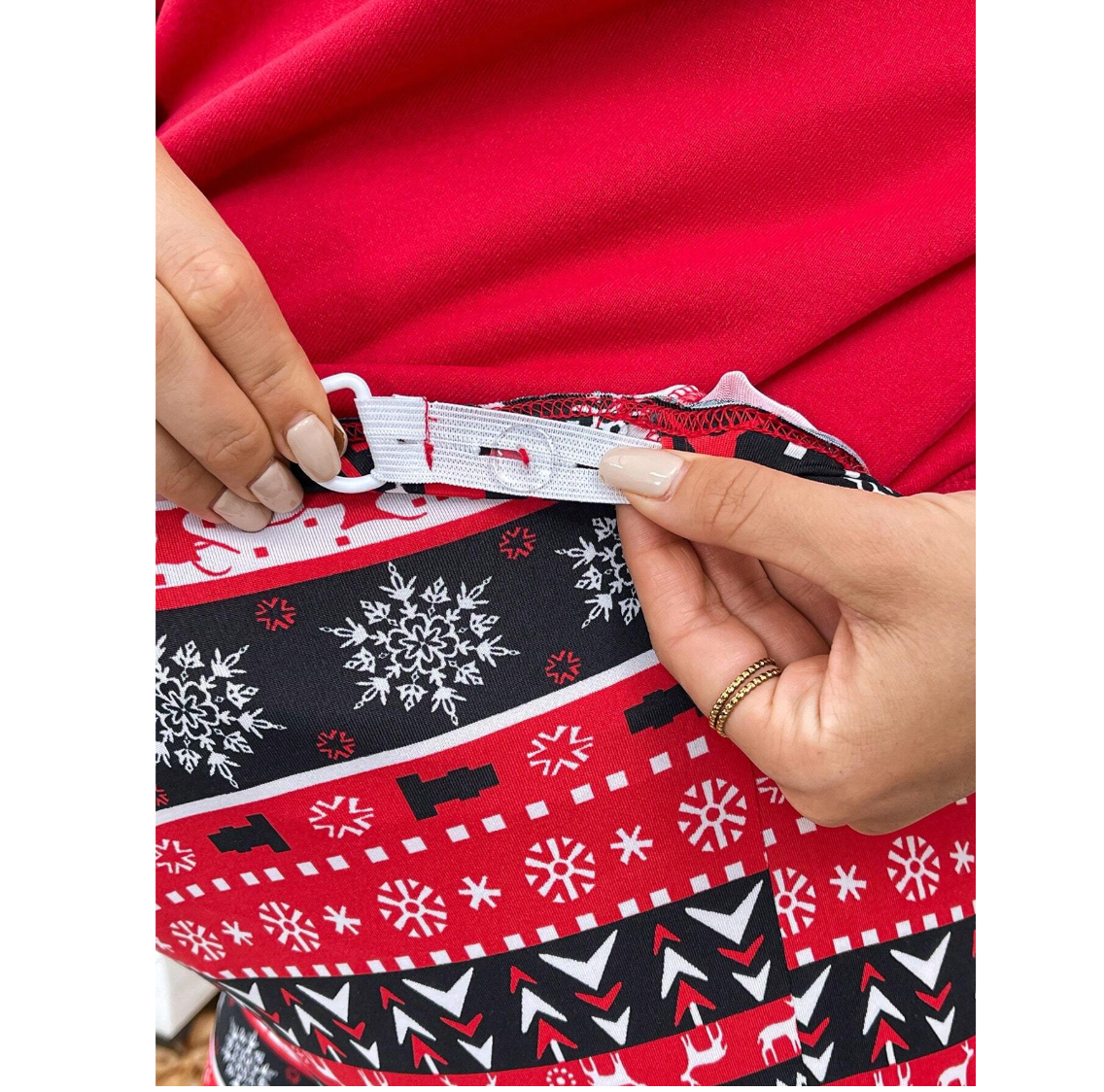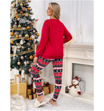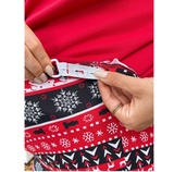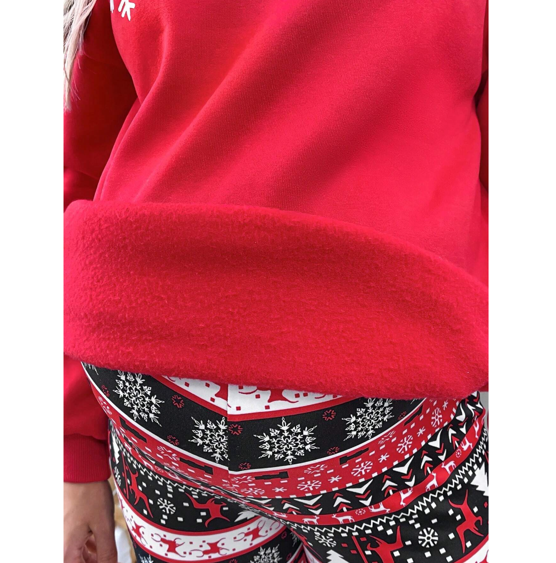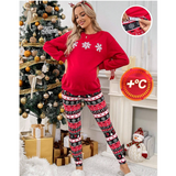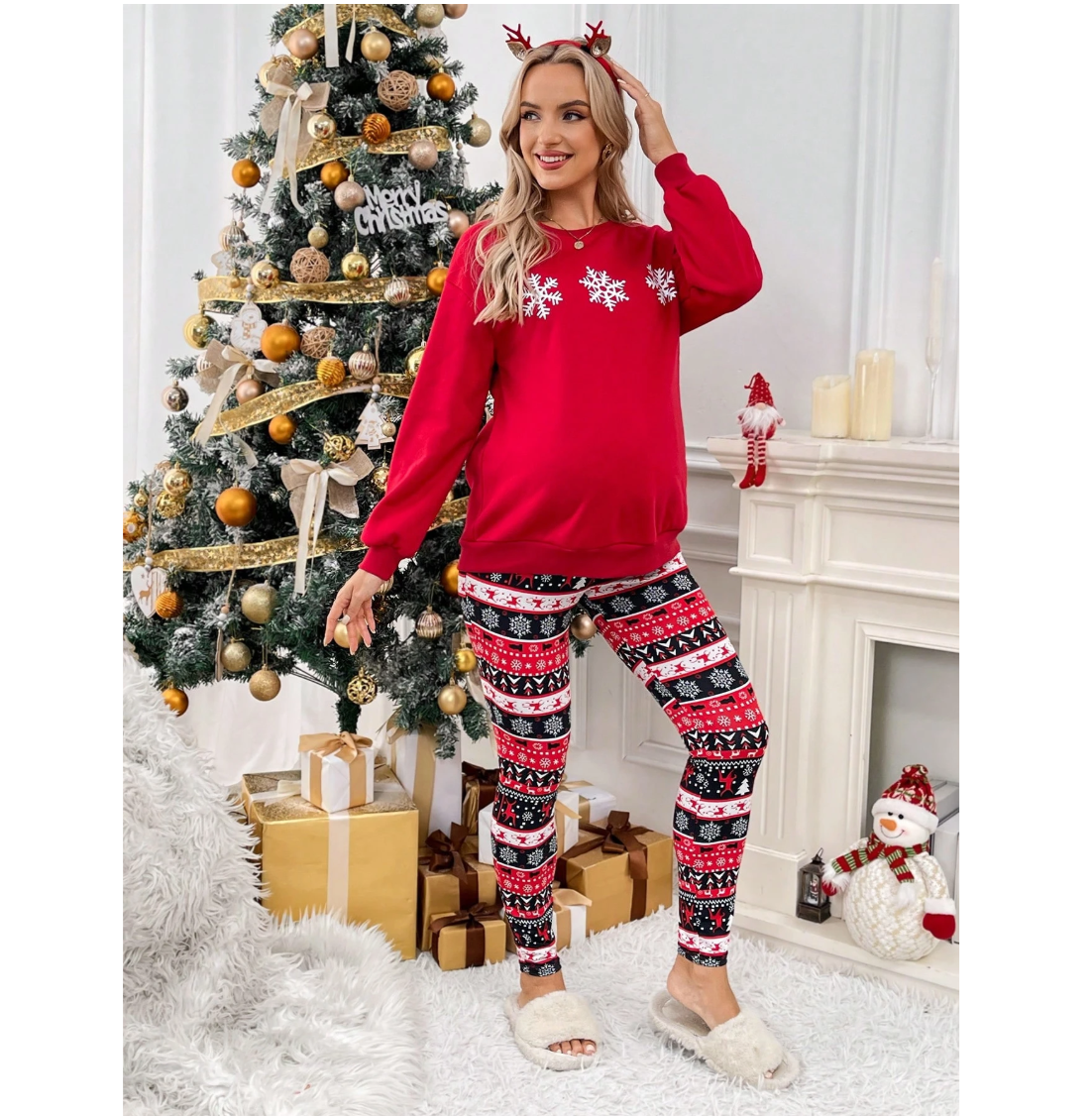 Maternity Christmas Set: Relaxed Fit Round Neck Drop Shoulder Fleece Sweatshirt With Red Prints + Adjustable Waist Skinny Pants