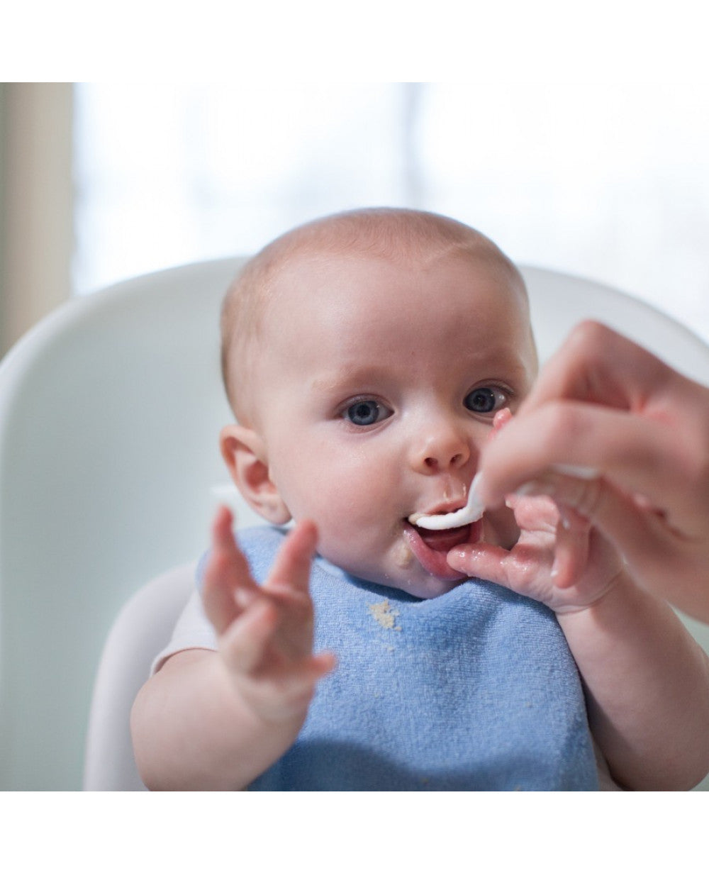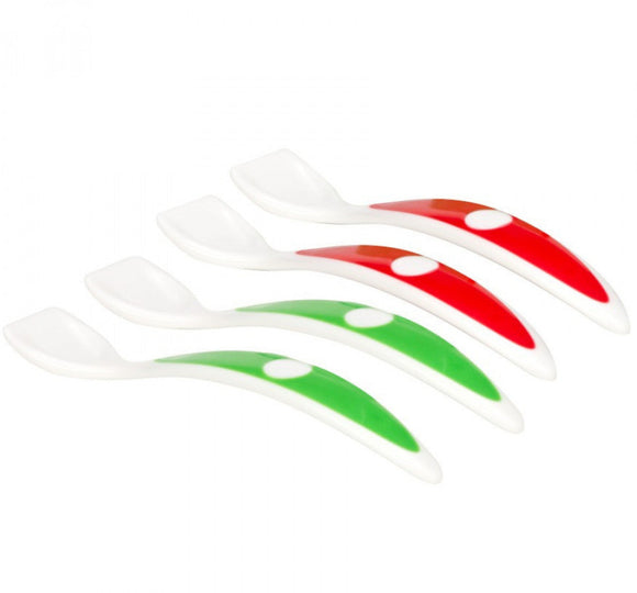 The 4 Long Spatula Spoons include 1 orange, 1 yellow, 1 green and 1 purple, that have extra long comfortable handles to reach the bottom of taller jars. Additionally, the spatula edge helps wipe food from a baby's mouth.