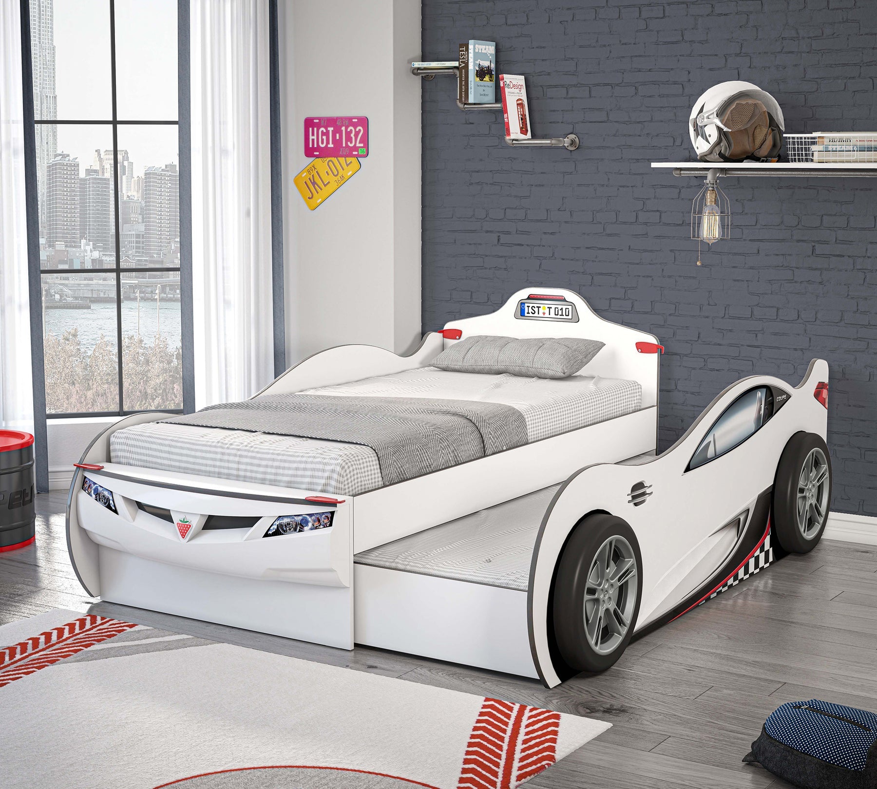 A second bed or toy compartment emerges when a car bed, which leaves a fascinated car with a curved lines, license plate, checkered stickers and car beds with cars.