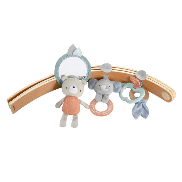 • Includes 6 removable activity toys: plush bear, bead rattle, mirror, natural rubber apple toy, wooden ring toy and tummy time pillow