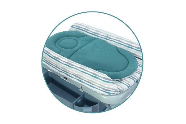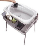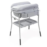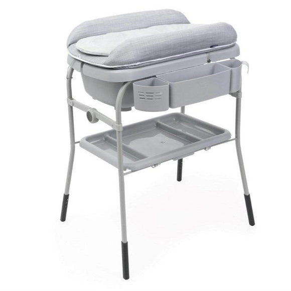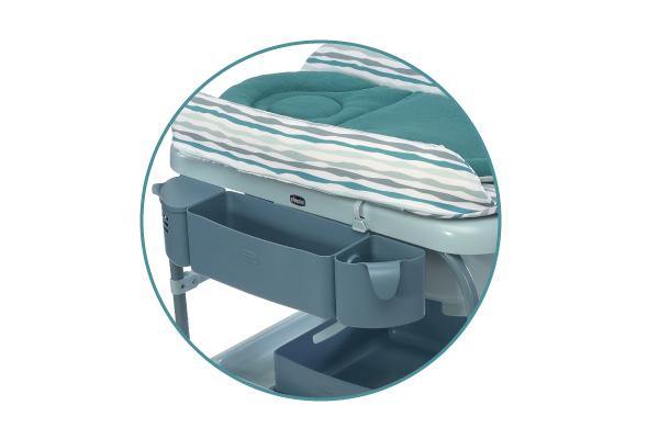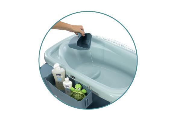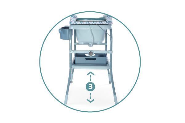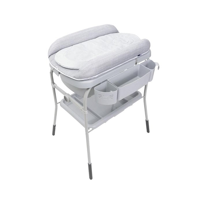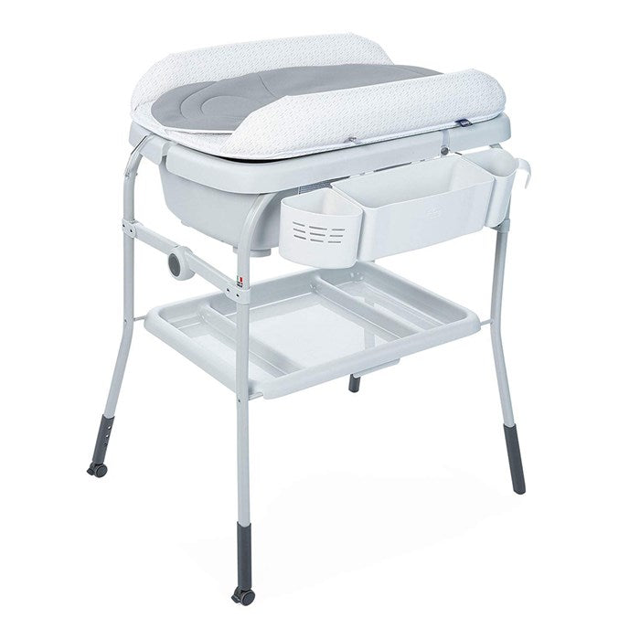 Cuddle & bubble is a practical bath and changer, it has a removable ergonomic bathtub with anti-slip inserts, a removable soft mattress, many practical storage compartments for store baby’s diapers and bath accessories,  a shower holder and quick draining duct. The quick folding structure is compact and can be adjusted to 3 levels to match your needs!