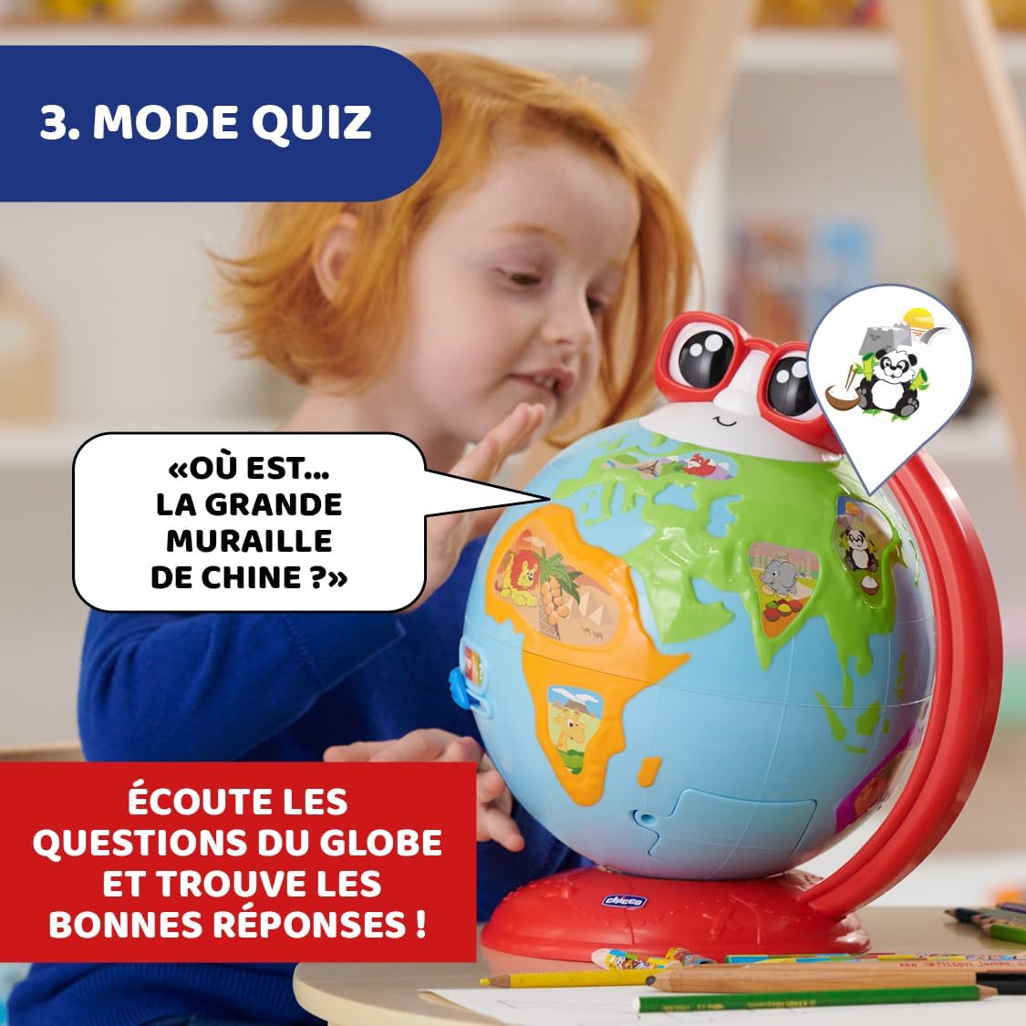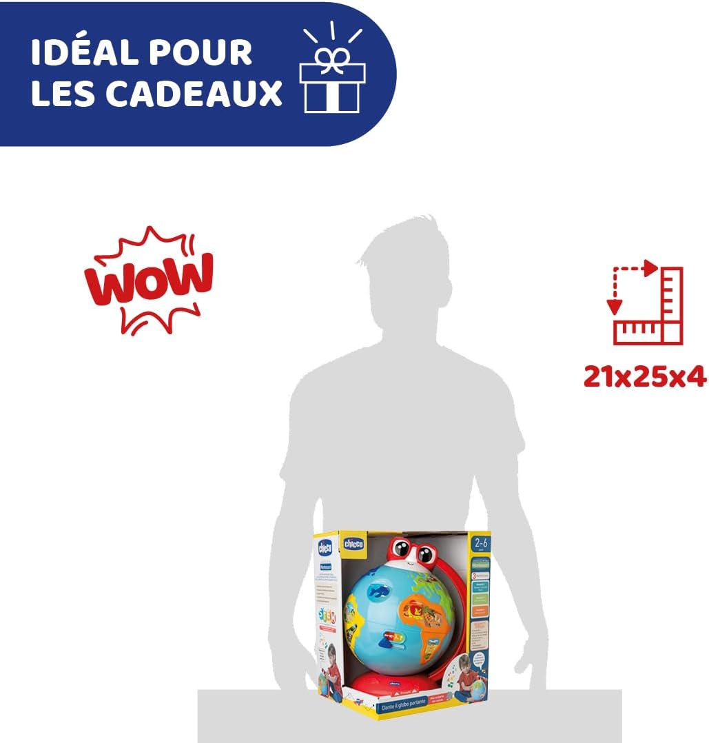 • GLOBU ÉLECTRONIQUE: Le Chicco Edu Globe est un globe interactif avec lequel vos enfants apprennent à connaître la géographie : il se déroule en voyage où ils découvrent les merveilles de notre planète