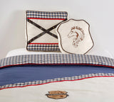 • Navy blue, cream and plaid fabric 65% polyester, 35% cotton
