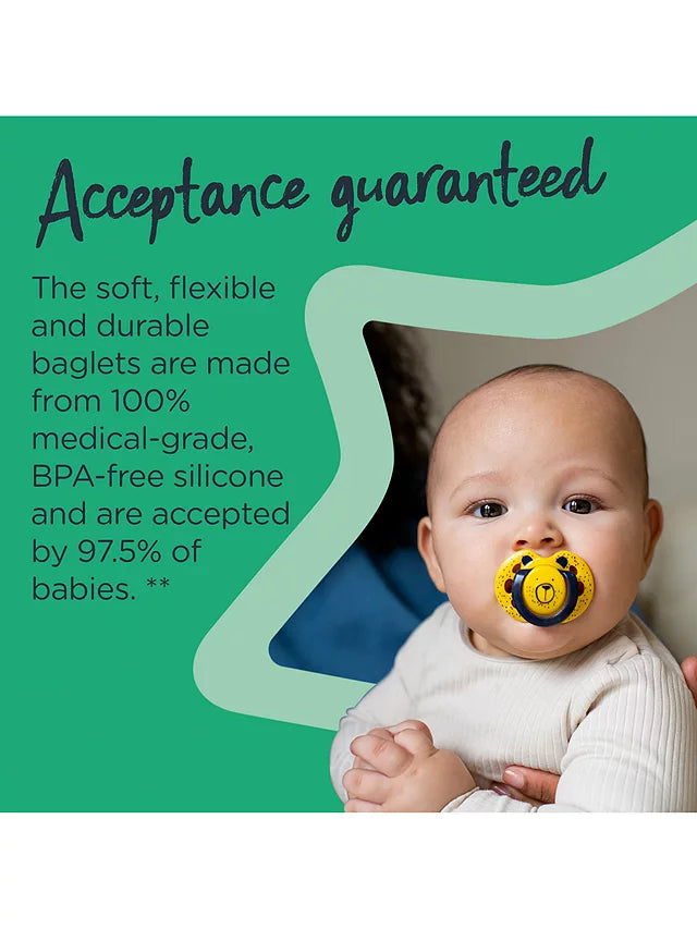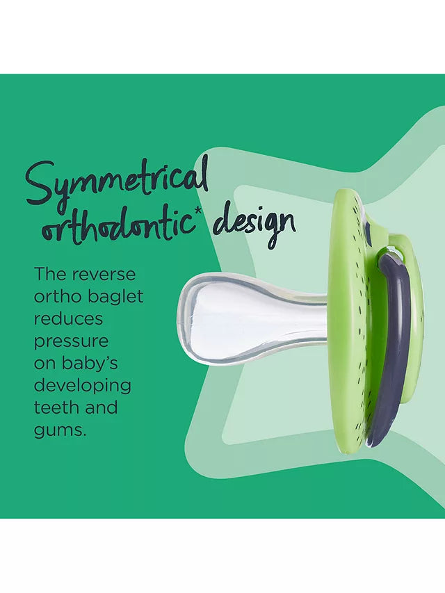 Soothe baby with this pack of two symmetrical orthodontic silicone soothers from Tommee Tippee.