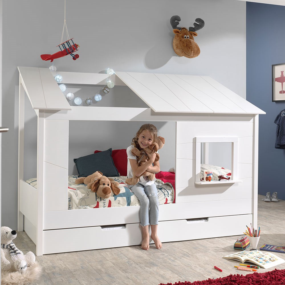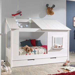 Give your kiddie the bed they deserve with the Hideaway House Bed, you are sure to earn some serious brownie points with this beautiful playhouse bed. Manufactured from solid pine and MDF, with a roof and cut out window, you're youngster can let their imaginations run wild with a playhouse bed  and then when they're all tuckered out gaze at the stars whilst drifting off! You could even add the optional trundle drawer, making this raised childrens bed ideal for sleepovers or just for a bit of extra storage. Whatever you choose it will be a wonderful addition. So string up some fairy lights and create the perfect cosy den for them!