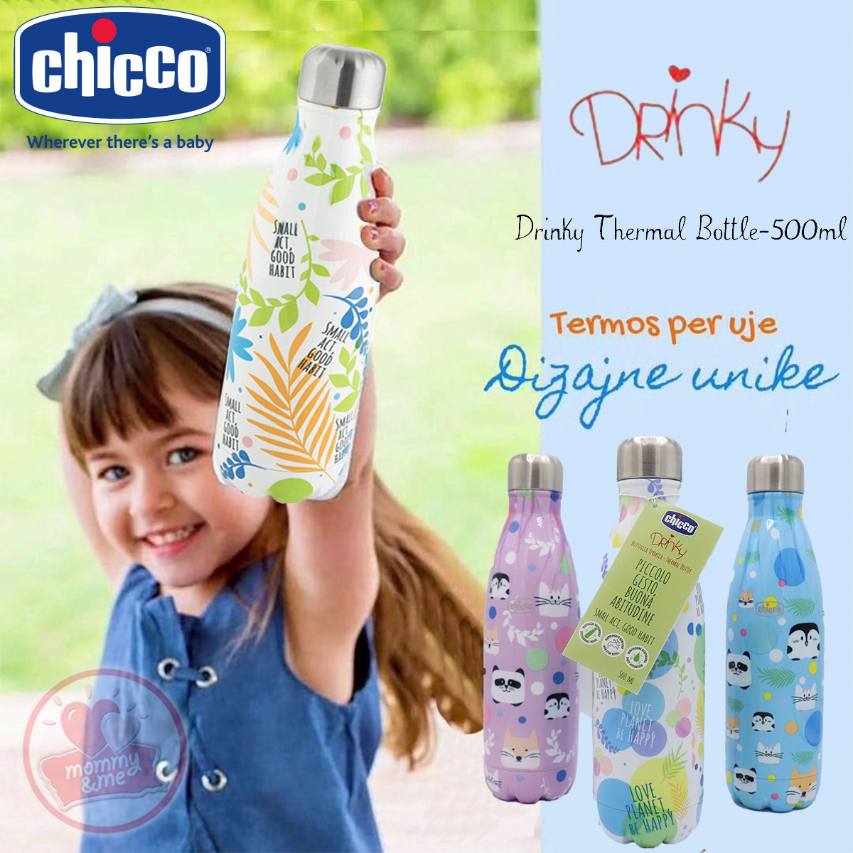 With the Chicco stainless steel bottles you can also keep every drink at the right temperature: the Chicco thermal bottle allows you to keep its contents warm for up to 6 hours, and thanks to colorful and funny patterns it encourages the child to hydrate independently.