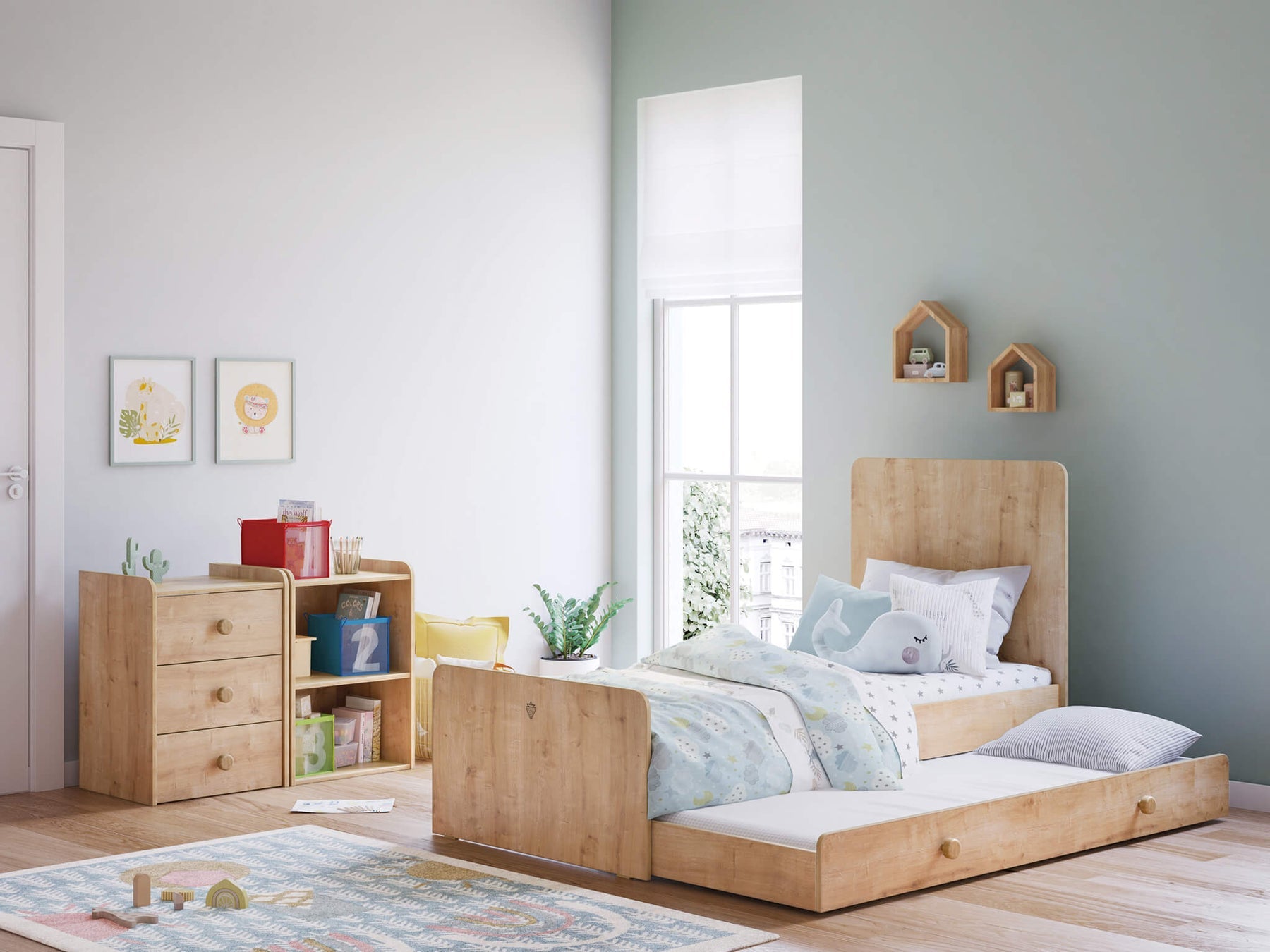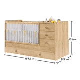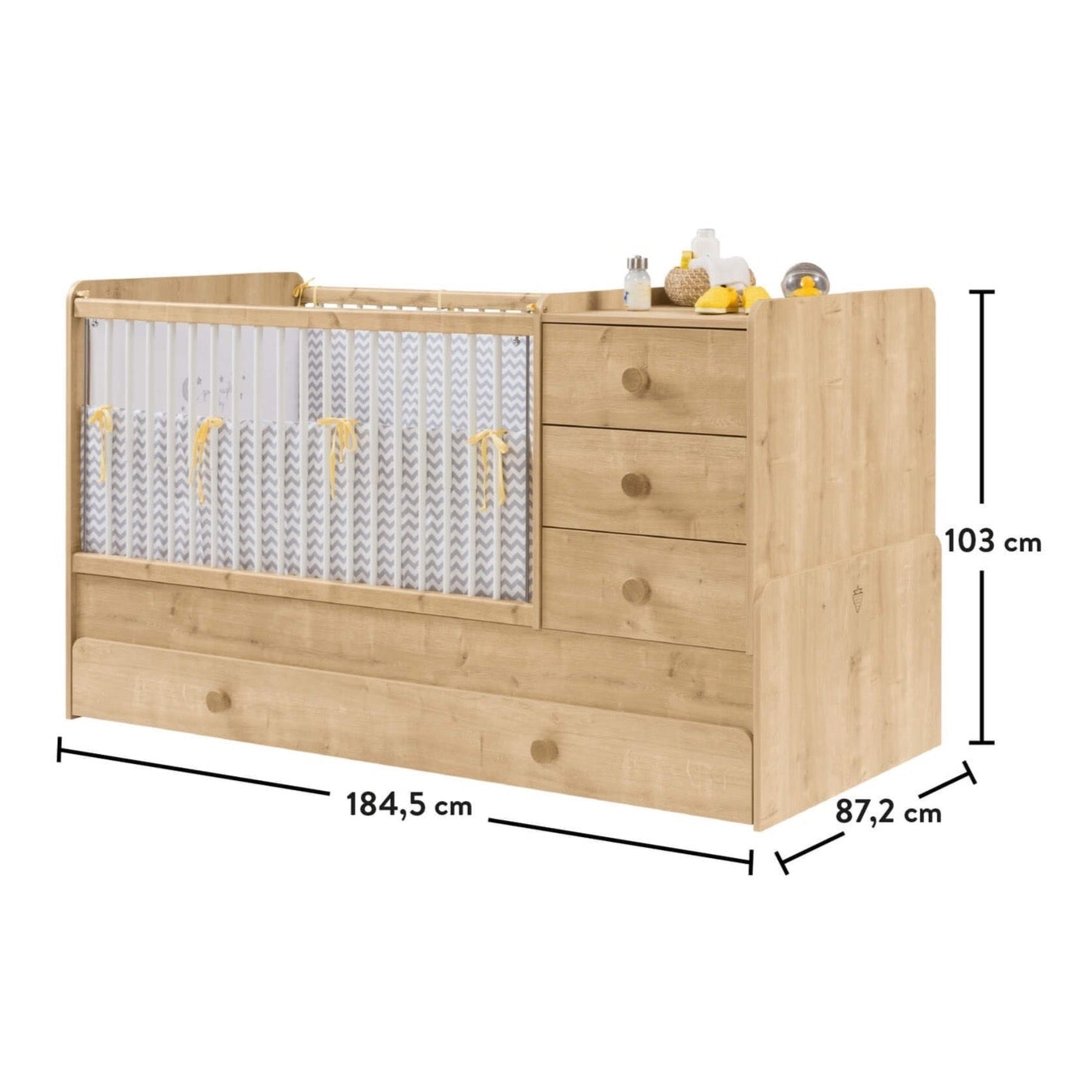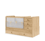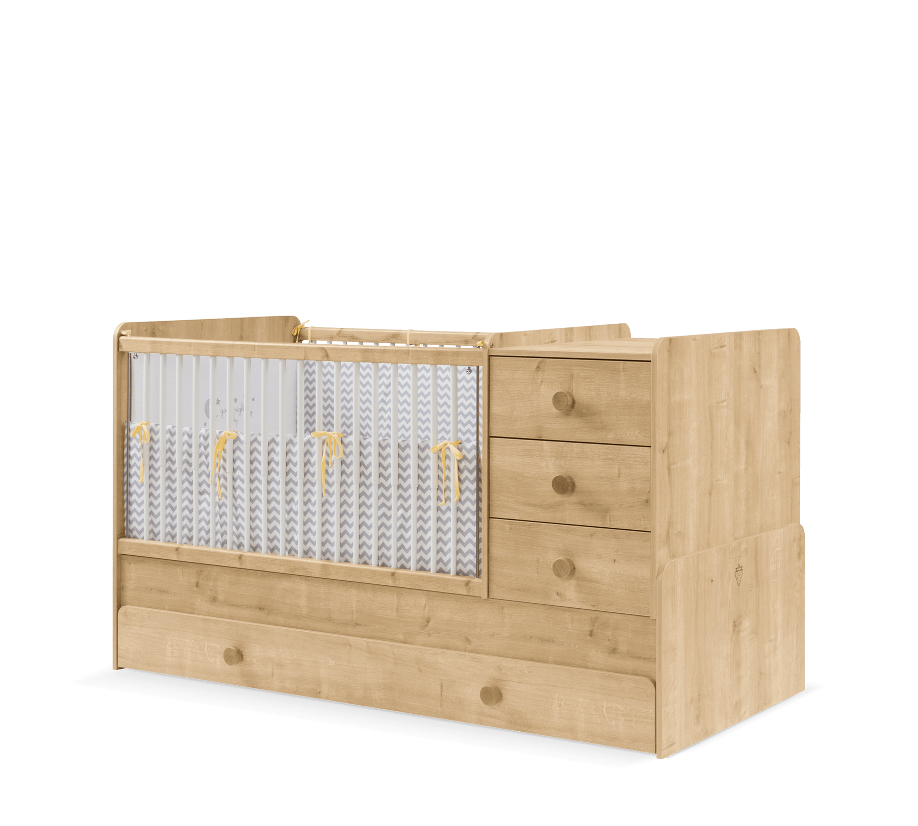 Mocha growing baby cot (80 x 180 cm) offers comfort for both babies and mothers thanks to their functional properties. There are three drawers blocks on the end of the cot that can be used in later ages. The back of the drawers has a shelf unit. The upper part of the block with drawer is designed as a lower opening area. Telescopic railing is used in the cot, which can be divided into two, and the lower parent cot with a wheel. The corners of the cot are rounded for the health of the baby.
