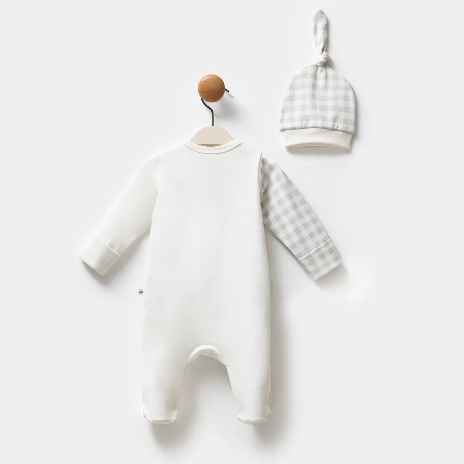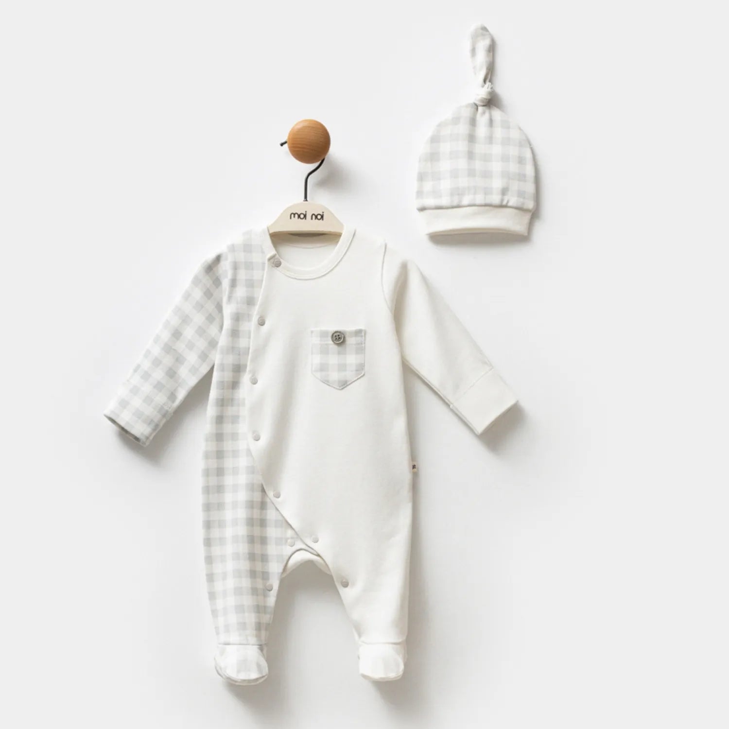 Tulum is a product unisex baby romper or overall with a matching hat, featuring a plaid (ekose) design. made in Turkey.