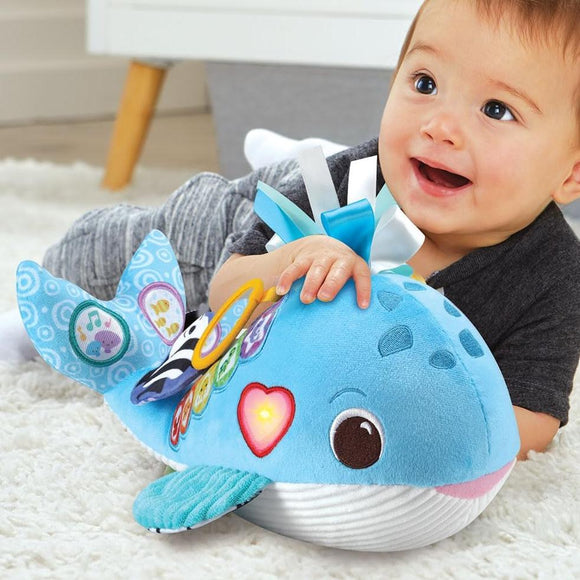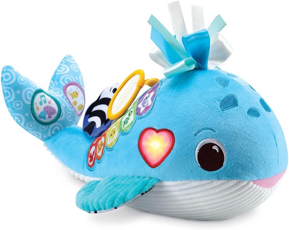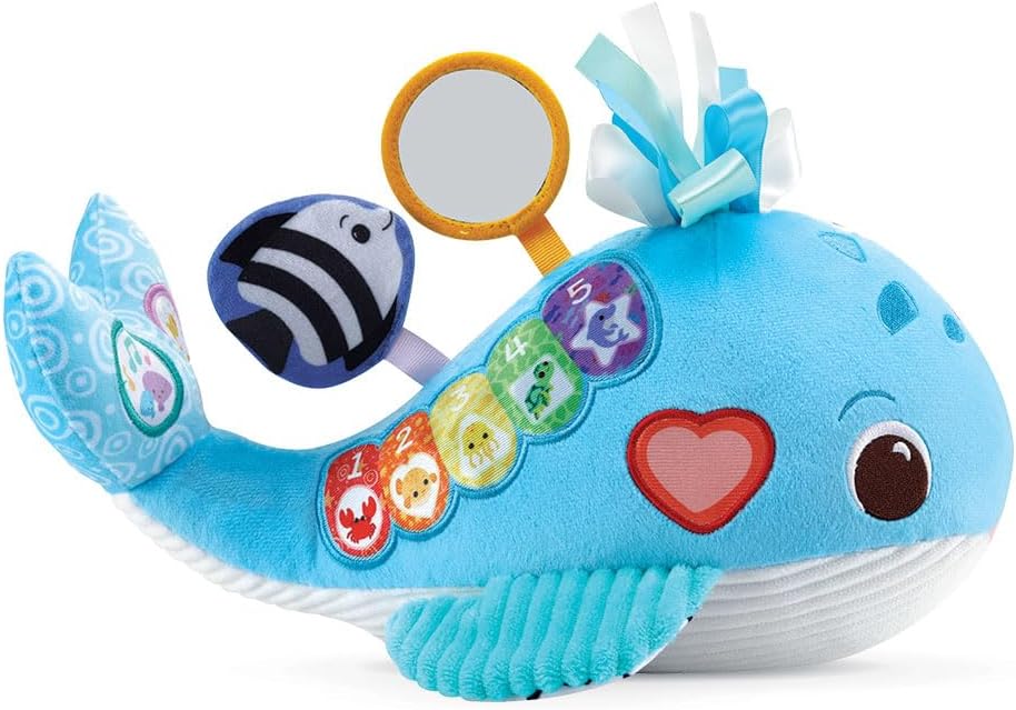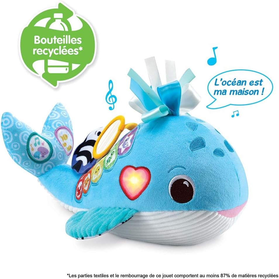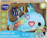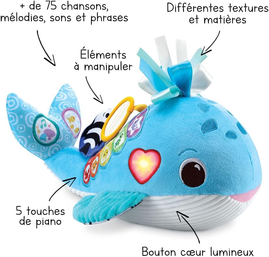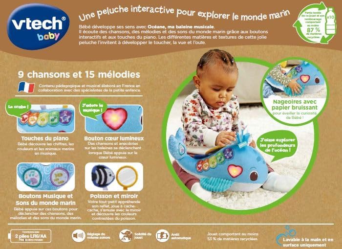 Océane, ma baleine musicale by VTech is an interactive and stimulating plush toy designed to explore the wonders of the ocean for babies aged 3 months and up. The plush toy features various colors, music, sounds related to marine life, and a variety of fabrics and textures to stimulate the baby's senses and curiosity. It offers 9 songs, 15 melodies, and a volume control feature. The toy is designed to promote learning about marine animals, sensory stimulation, colors, and numbers.