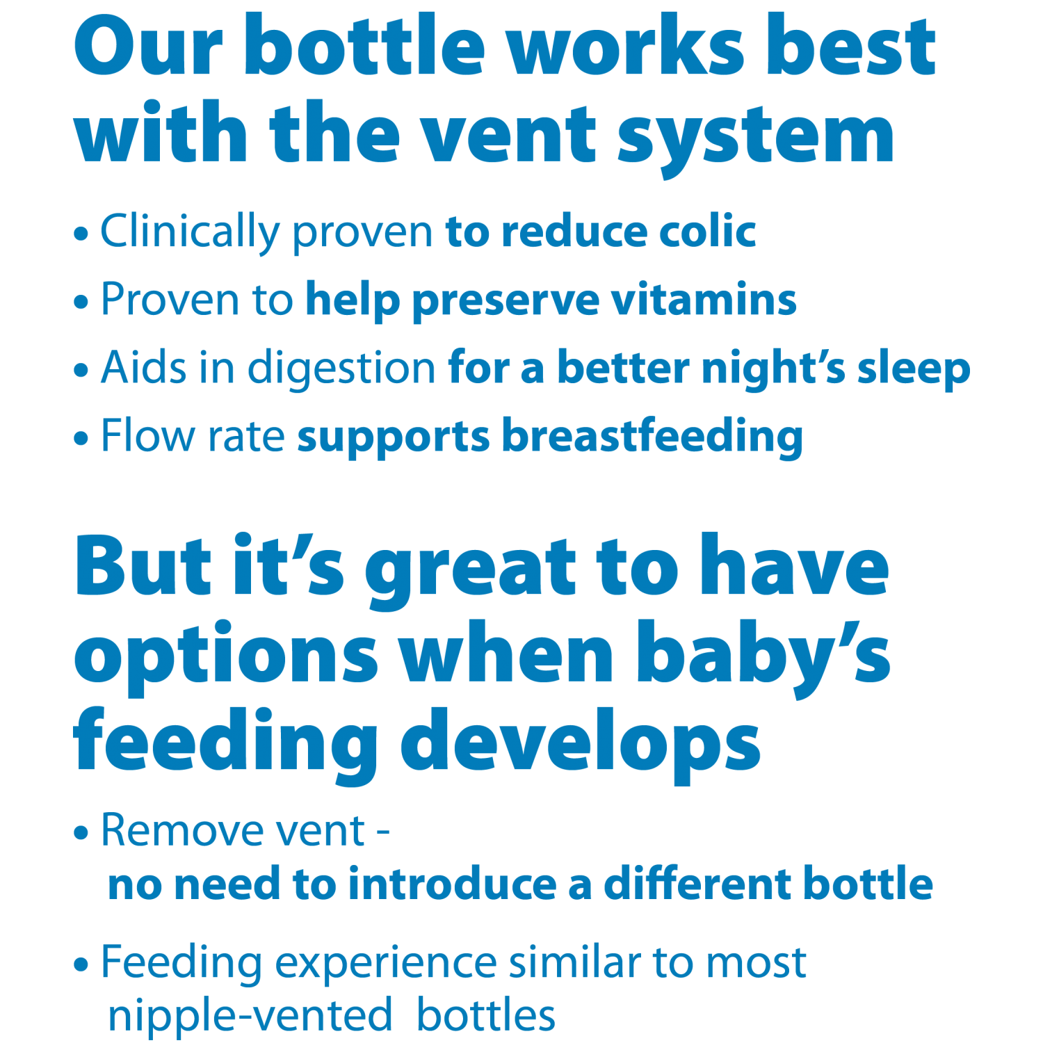 • Dr. Brown's Options The market's first convertible bottle that can be used with or without the vent system. The new vent system is designed to grow with baby, and Dr Brown's recommend using this system to experience all the health benefits of our bottle. It helps reduce feeding problems, helps digestion and helps preserve vitamins. Some moms and dads find removing the vent a convenient option as their baby's feeding becomes more developed. The nipple venting creates a paced flow, and provides a feeding experience similar to most nipple-vented bottles. Options bottles fit most breast pumps, and are BPA-free.