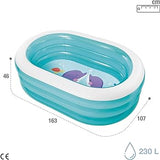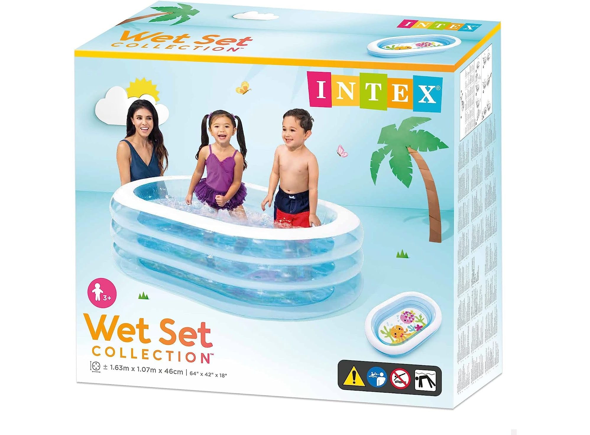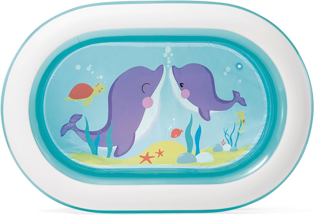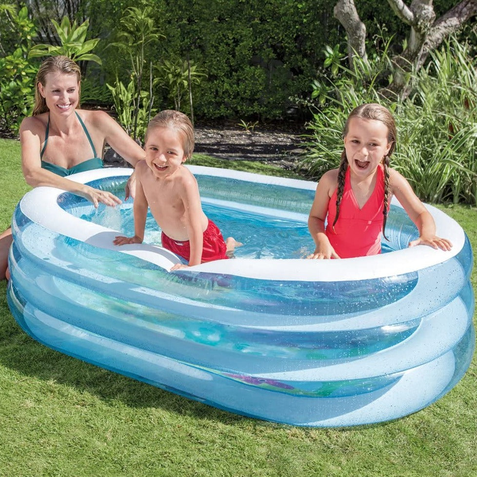 Inflatable children’s pool with transparent outer walls and drainage system in the floor. With its high sides, the pool can also be used for deep dives with no head.