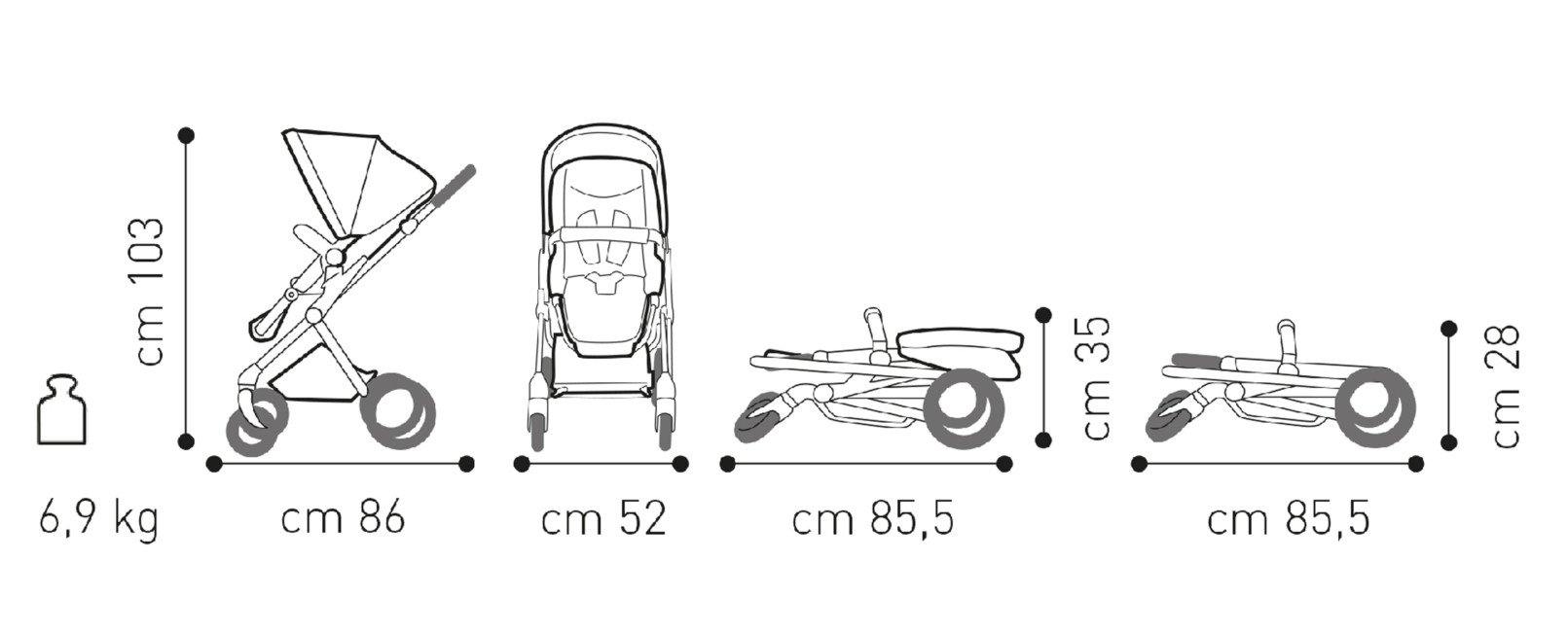 Thanks to its tight and frame, only 52,5 cm, and 6,9 kg, Presto City allows you to move easily and quickly in the city. Light and handy, it can be combined with the the car seat Smart Silverline group 0+. Full optional equipment: bag with changing matress, footmuff (carrycot cover) and rain cover.