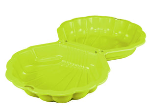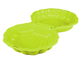 Sandbox, green plastic, gold button shape, 1-2 children.