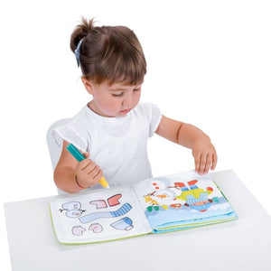 • By filling the container of the marker with water, as soon as the marker's tip touches the booklet, the colors within the drawings will magically appear